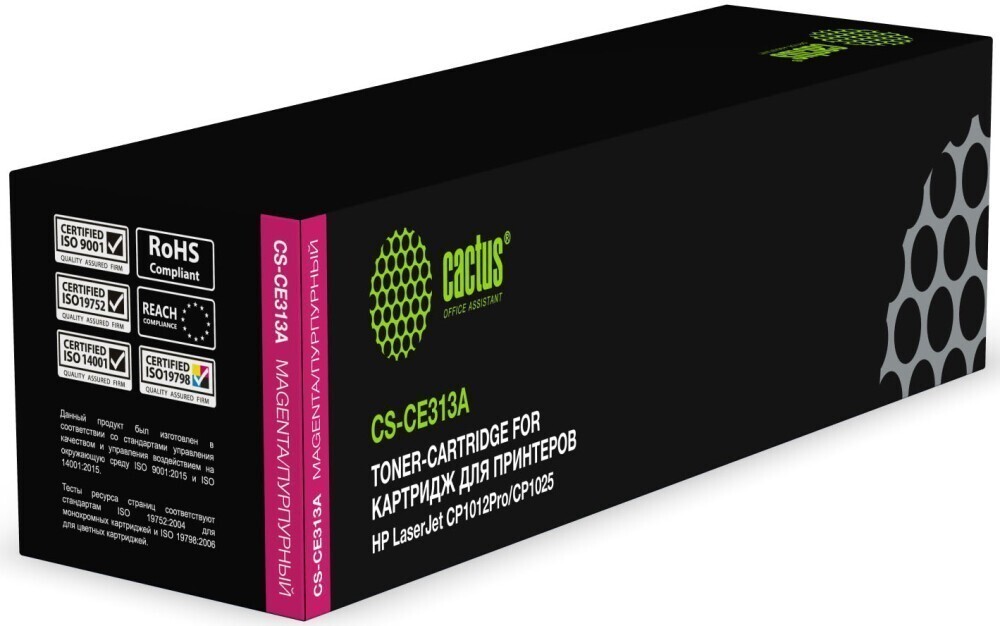 Доставка в 75000 населённых пунктов, ТК СДЭК, Яндекс и Почта РФ Все формы оплаты для физических и юридических лиц! Онлайн конфигуратор ПК, бесплатная сборка. Гарантия 2 года! Широкий ассортимент комплектующих. Более 30 лет на рынке! 700 ₽ ID товара: 177703 Картридж Cactus CS-CE313A Magenta ОсновныеПроизводитель ........................................................................................................................................................................................................ Код производителя ........................................................................................................................................................................................................ CS-CE313A Тип ........................................................................................................................................................................................................ Тип печати ........................................................................................................................................................................................................ Тип совместимости ........................................................................................................................................................................................................ Совместимый производитель ........................................................................................................................................................................................................ HP Цвет ........................................................................................................................................................................................................ пурпурный (magenta) Совместимость ........................................................................................................................................................................................................ HP Color LaserJet CP1025, HP Color LaserJet CP1025nw, HP LaserJet Pro M175a (CE865A), HP LaserJet Pro M175nw (CE866A), HP TopShot LaserJet Pro M275 ДополнительноРесурс ........................................................................................................................................................................................................ 1000 стр. Количество в упаковке ........................................................................................................................................................................................................ 1 шт. Сайт производителя ........................................................................................................................................................................................................ |