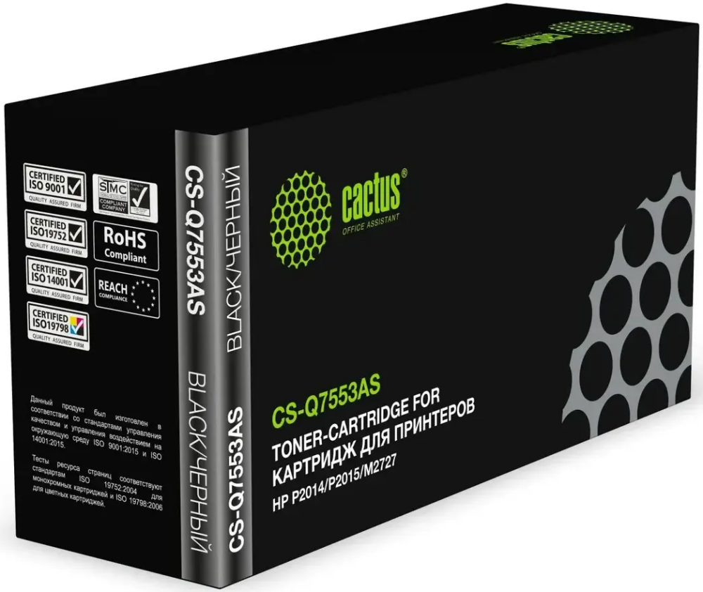 Доставка в 75000 населённых пунктов, ТК СДЭК, Яндекс и Почта РФ Все формы оплаты для физических и юридических лиц! Онлайн конфигураторы ПК и сервера, бесплатная сборка. Гарантия 2 года! Широкий ассортимент комплектующих. Более 30 лет на рынке! 970 ₽ ID товара: 177742 Картридж Cactus CS-Q7553AS Black ОсновныеПроизводитель ........................................................................................................................................................................................................ Код производителя ........................................................................................................................................................................................................ CS-Q7553AS Тип ........................................................................................................................................................................................................ Тип печати ........................................................................................................................................................................................................ Тип совместимости ........................................................................................................................................................................................................ Совместимый производитель ........................................................................................................................................................................................................ HP Цвет ........................................................................................................................................................................................................ чёрный (black) Совместимость ........................................................................................................................................................................................................ HP LaserJet M2727nf, HP LaserJet M2727nfs, HP LaserJet P2014, HP LaserJet P2014n, HP LaserJet P2015, HP LaserJet P2015d, HP LaserJet P2015dn, HP LaserJet P2015n, HP LaserJet P2015x ДополнительноРесурс ........................................................................................................................................................................................................ 3000 стр. Количество в упаковке ........................................................................................................................................................................................................ 1 шт. Сайт производителя ........................................................................................................................................................................................................ |