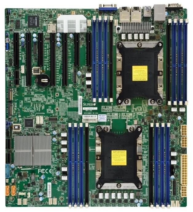Доставка в 75000 населённых пунктов, ТК СДЭК, Яндекс и Почта РФ Все формы оплаты для физических и юридических лиц! Онлайн конфигураторы ПК и сервера, бесплатная сборка. Гарантия 2 года! Широкий ассортимент комплектующих. Более 30 лет на рынке! ID товара: 349935 Серверная материнская плата SuperMicro X11DPH-T-B ОсновныеПроизводитель ........................................................................................................................................................................................................ Код производителя ........................................................................................................................................................................................................ MBD-X11DPH-T-B Socket ........................................................................................................................................................................................................ Количество сокетов ........................................................................................................................................................................................................ Поддерживаемые процессоры ........................................................................................................................................................................................................ Intel Xeon Scalable Processors Максимальное тепловыделение ........................................................................................................................................................................................................ 205 Вт Чипсет ........................................................................................................................................................................................................ ПамятьСтандарт памяти ........................................................................................................................................................................................................ Тип поддерживаемой памяти ........................................................................................................................................................................................................ RDIMM, LRDIMM Количество слотов памяти ........................................................................................................................................................................................................ Поддержка частот ........................................................................................................................................................................................................ 2133 МГц, 2400 МГц, 2666 МГц, 2933 МГц Максимальный объём памяти ........................................................................................................................................................................................................ Дисковые контроллеры и слоты расширенияДисковые контроллеры ........................................................................................................................................................................................................ 10 x SATA-III (6 Гб/с) Поддержка RAID ........................................................................................................................................................................................................ 0, 1, 5, 10 Слоты расширения ........................................................................................................................................................................................................ 3 x PCI-E 3.0 x16, 4 x PCI-E x8, 2 x M.2 Аудио/видеоВстроенный видеоадаптер ........................................................................................................................................................................................................ да, на основе Aspeed AST2500 СетьСетевой интерфейс ........................................................................................................................................................................................................ 2 x 10 Gigabit Ethernet (10 Гбит/с) ПодключениеРазъёмы на задней панели ........................................................................................................................................................................................................ 4 x USB 3.2 Gen 1, VGA, 2 x RJ-45, COM Основной разъём питания ........................................................................................................................................................................................................ 24-pin ДополнительноФорм-фактор ........................................................................................................................................................................................................ Гарантия ........................................................................................................................................................................................................ 12 м