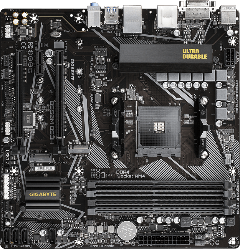 Доставка в 75000 населённых пунктов, ТК СДЭК, Яндекс и Почта РФ Все формы оплаты для физических и юридических лиц! Онлайн конфигураторы ПК и сервера, бесплатная сборка. Гарантия 2 года! Широкий ассортимент комплектующих. Более 30 лет на рынке! ID товара: 360630 Материнская плата Gigabyte B550M DS3H (rev. 1.0/1.1/1.2/1.3) ОсновныеПроизводитель ........................................................................................................................................................................................................ Код производителя ........................................................................................................................................................................................................ B550M DS3H (rev. 1.0/1.1/1.2/1.3) Внимание ........................................................................................................................................................................................................ работа процессоров Ryzen 1-го и 2-го поколений на плате с чипсетом B550 официально не поддерживается Сокет ........................................................................................................................................................................................................ Чипсет ........................................................................................................................................................................................................ ПамятьТип памяти ........................................................................................................................................................................................................ Количество слотов памяти ........................................................................................................................................................................................................ Поддержка ........................................................................................................................................................................................................ Intel XMP Дисковые контроллерыКонтроллер SATA ........................................................................................................................................................................................................ 4 x SATA-III (6 Гб/с) Поддержка RAID ........................................................................................................................................................................................................ 0, 1, 10 Слоты расширенияСлоты расширения ........................................................................................................................................................................................................ PCI-E 4.0 x16, PCI-E 3.0 x16, PCI-E x1, 2 x PCI-E M.2 Тип слотов M.2 ........................................................................................................................................................................................................ - Socket 3, M key, 2242/2260/2280/22110; - Socket 3, M key, 2242/2260/2280. Поддерживаемые режимы PCI-Express ........................................................................................................................................................................................................ 1 разъем PCI Express x16 (PCIEX16), реализован средствами PCIe-линий ЦП: - процессорами AMD Ryzen 3-поколения поддерживается режим PCIe 4.0 x16 для плат расширений; - процессорами AMD Ryzen 3-поколения с интегрированным графическим ядром Radeon поддерживается режим PCIe 3.0 x16 для плат расширений. 1 разъем PCI Express x4 (PCIEX4), реализован средствами PCIe-линий чипсета: - поддерживается режим PCIe 3.0 x4. Аудио/ВидеоИнтегрированное видео ........................................................................................................................................................................................................ Звук ........................................................................................................................................................................................................ Аудио-контроллер ........................................................................................................................................................................................................ СетьСетевой интерфейс ........................................................................................................................................................................................................ Gigabit Ethernet (1 Гбит/с) Сетевой контроллер ........................................................................................................................................................................................................ Realtek RTL8118AS ИнтерфейсыРазъёмы на задней панели .......................................................................
