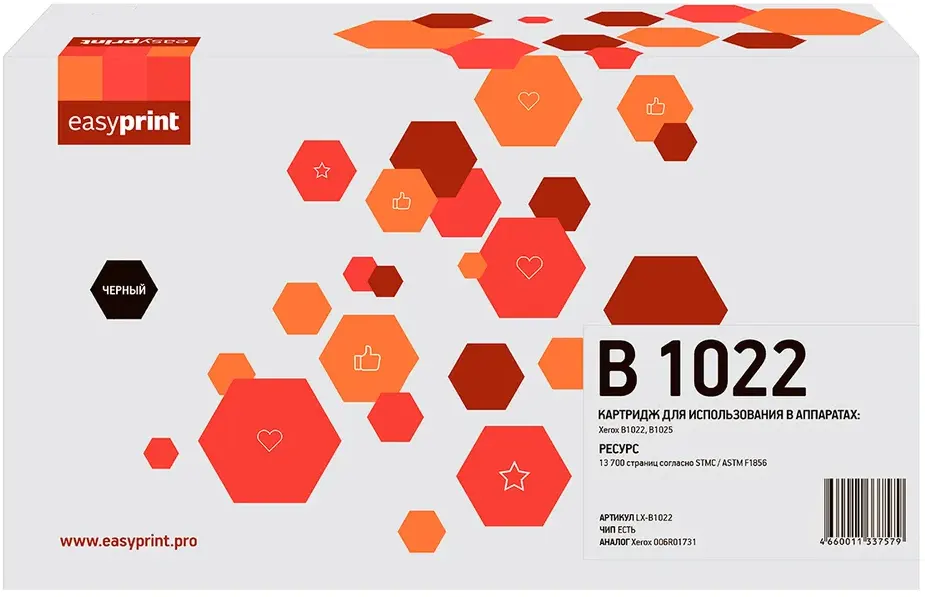 Доставка в 75000 населённых пунктов, ТК СДЭК, Яндекс и Почта РФ Все формы оплаты для физических и юридических лиц! Онлайн конфигураторы ПК и сервера, бесплатная сборка. Гарантия 2 года! Широкий ассортимент комплектующих. Более 30 лет на рынке! 1 150 ₽ ID товара: 397016 Картридж EasyPrint LX-B1022 Black ОсновныеПроизводитель ........................................................................................................................................................................................................ Код производителя ........................................................................................................................................................................................................ LX-B1022 Тип ........................................................................................................................................................................................................ Тип печати ........................................................................................................................................................................................................ Тип совместимости ........................................................................................................................................................................................................ Совместимый производитель ........................................................................................................................................................................................................ Xerox Цвет ........................................................................................................................................................................................................ чёрный (black) Совместимость ........................................................................................................................................................................................................ Xerox B1022, Xerox B1025DN, Xerox B1025DNA ДополнительноРесурс ........................................................................................................................................................................................................ 13700 стр. Количество в упаковке ........................................................................................................................................................................................................ 1 шт. Сайт производителя ........................................................................................................................................................................................................ |