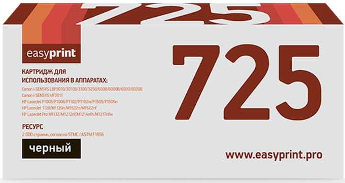 Доставка в 75000 населённых пунктов, ТК СДЭК, Яндекс и Почта РФ Все формы оплаты для физических и юридических лиц! Онлайн конфигуратор ПК, бесплатная сборка. Гарантия 2 года! Широкий ассортимент комплектующих. Более 30 лет на рынке! 650 ₽ ID товара: 397139 Картридж EasyPrint LC-725U Black ОсновныеПроизводитель ........................................................................................................................................................................................................ Код производителя ........................................................................................................................................................................................................ LC-725U Тип ........................................................................................................................................................................................................ Тип печати ........................................................................................................................................................................................................ Тип совместимости ........................................................................................................................................................................................................ Совместимый производитель ........................................................................................................................................................................................................ Canon, HP Цвет ........................................................................................................................................................................................................ чёрный (black) Совместимость ........................................................................................................................................................................................................ Canon i-SENSYS LBP3010, Canon i-SENSYS LBP3010B, Canon i-SENSYS LBP6000, Canon i-SENSYS LBP6000B, Canon i-SENSYS LBP6020, Canon i-SENSYS LBP6020B, Canon i-SENSYS LBP6030W, Canon LBP-3250, HP LaserJet M1120, HP LaserJet M1120n, HP LaserJet M1522, HP LaserJet M1522n, HP LaserJet M1522nf, HP LaserJet P1005, HP LaserJet P1505, HP LaserJet P1505n, HP LaserJet Pro M1212NF, HP LaserJet Pro P1102 ДополнительноРесурс ........................................................................................................................................................................................................ 2000 стр. Количество в упаковке ........................................................................................................................................................................................................ 1 шт. Сайт производителя ........................................................................................................................................................................................................ |