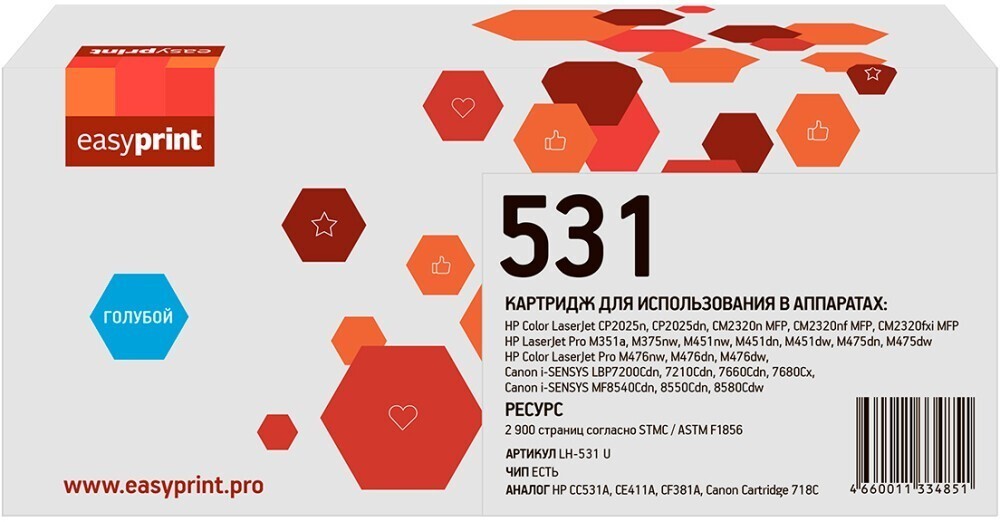 Доставка в 75000 населённых пунктов, ТК СДЭК, Яндекс и Почта РФ Все формы оплаты для физических и юридических лиц! Онлайн конфигураторы ПК и сервера, бесплатная сборка. Гарантия 2 года! Широкий ассортимент комплектующих. Более 30 лет на рынке! 1 110 ₽ ID товара: 397149 Картридж EasyPrint LH-531U Cyan ОсновныеПроизводитель ........................................................................................................................................................................................................ Код производителя ........................................................................................................................................................................................................ LH-531U Тип ........................................................................................................................................................................................................ Тип печати ........................................................................................................................................................................................................ Тип совместимости ........................................................................................................................................................................................................ Совместимый производитель ........................................................................................................................................................................................................ Canon, HP Цвет ........................................................................................................................................................................................................ голубой (cyan) Совместимость ........................................................................................................................................................................................................ Canon i-SENSYS LBP7200Cdn, Canon i-SENSYS LBP7210Cdn, Canon i-SENSYS LBP7660Cdn, Canon i-SENSYS LBP7680Cx, Canon i-SENSYS MF8540Cdn, Canon i-SENSYS MF8550Cdn, Canon i-SENSYS MF8580Cdw, HP Color LaserJet CM2320fxi, HP Color LaserJet CM2320n, HP Color LaserJet CP2025dn, HP Color LaserJet CP2025n, HP Color LaserJet MFP CM2320nf, HP Color LaserJet Pro M375nw (CE903A), HP Color LaserJet Pro M476dn (CF386A), HP Color LaserJet Pro M476dw (CF387A), HP Color LaserJet Pro M476nw (CF385A), HP LaserJet Color Pro 400 M451dn, HP LaserJet Color Pro 400 M451dw, HP LaserJet Color Pro 400 M451nw, HP LaserJet Color Pro 400 M475dn, HP LaserJet Color Pro 400 M475dw, HP LaserJet Pro M351a (CE955A) ДополнительноРесурс ........................................................................................................................................................................................................ 2900 стр. Количество в упаковке ........................................................................................................................................................................................................ 1 шт. Сайт производителя ........................................................................................................................................................................................................ |