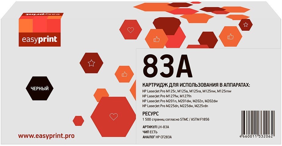 Доставка в 75000 населённых пунктов, ТК СДЭК, Яндекс и Почта РФ Все формы оплаты для физических и юридических лиц! Онлайн конфигуратор ПК, бесплатная сборка. Гарантия 2 года! Широкий ассортимент комплектующих. Более 30 лет на рынке! 190 ₽ ID товара: 397184 Картридж EasyPrint LH-83A Black ОсновныеПроизводитель ........................................................................................................................................................................................................ Код производителя ........................................................................................................................................................................................................ LH-83A Тип ........................................................................................................................................................................................................ Тип печати ........................................................................................................................................................................................................ Тип совместимости ........................................................................................................................................................................................................ Совместимый производитель ........................................................................................................................................................................................................ HP Цвет ........................................................................................................................................................................................................ чёрный (black) Совместимость ........................................................................................................................................................................................................ HP LaserJet Pro M125r (CZ176A), HP LaserJet Pro M125ra (CZ177A), HP LaserJet Pro M125rnw (CZ178A), HP LaserJet Pro M127fs (CZ187A), HP LaserJet Pro M127fw (CZ183A), HP LaserJet Pro M201d (CF466A), HP LaserJet Pro M201dw (CF456A), HP LaserJet Pro M201n (CF455A), HP LaserJet Pro M225dn (CF484A), HP LaserJet Pro M225rdn (CF486A), HP LaserJet Pro MFP M225dw (CF485A) ДополнительноРесурс ........................................................................................................................................................................................................ 1500 стр. Количество в упаковке ........................................................................................................................................................................................................ 1 шт. Сайт производителя ........................................................................................................................................................................................................ |
