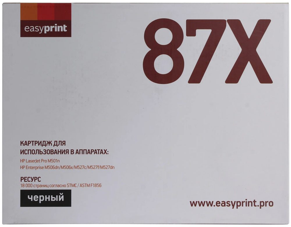Доставка в 75000 населённых пунктов, ТК СДЭК, Яндекс и Почта РФ Все формы оплаты для физических и юридических лиц! Онлайн конфигураторы ПК и сервера, бесплатная сборка. Гарантия 2 года! Широкий ассортимент комплектующих. Более 30 лет на рынке! 1 610 ₽ ID товара: 397186 Картридж EasyPrint LH-87X Black ОсновныеПроизводитель ........................................................................................................................................................................................................ Код производителя ........................................................................................................................................................................................................ LH-87X Тип ........................................................................................................................................................................................................ Тип печати ........................................................................................................................................................................................................ Тип совместимости ........................................................................................................................................................................................................ Совместимый производитель ........................................................................................................................................................................................................ HP Цвет ........................................................................................................................................................................................................ чёрный (black) Совместимость ........................................................................................................................................................................................................ HP LaserJet Enterprise Flow M527z (F2A78A), HP LaserJet Enterprise M506dh (F2A71A), HP LaserJet Enterprise M506dn (F2A69A), HP LaserJet Enterprise M506n (F2A68A), HP LaserJet Enterprise M506x (F2A70A), HP LaserJet Enterprise M527dn (F2A76A), HP LaserJet Enterprise MFP M527f (F2A77A), HP LaserJet Pro M501dn (J8H61A), HP LaserJet Pro M501n (J8H60A) ДополнительноРесурс ........................................................................................................................................................................................................ 18000 стр. Количество в упаковке ........................................................................................................................................................................................................ 1 шт. Сайт производителя ........................................................................................................................................................................................................ |