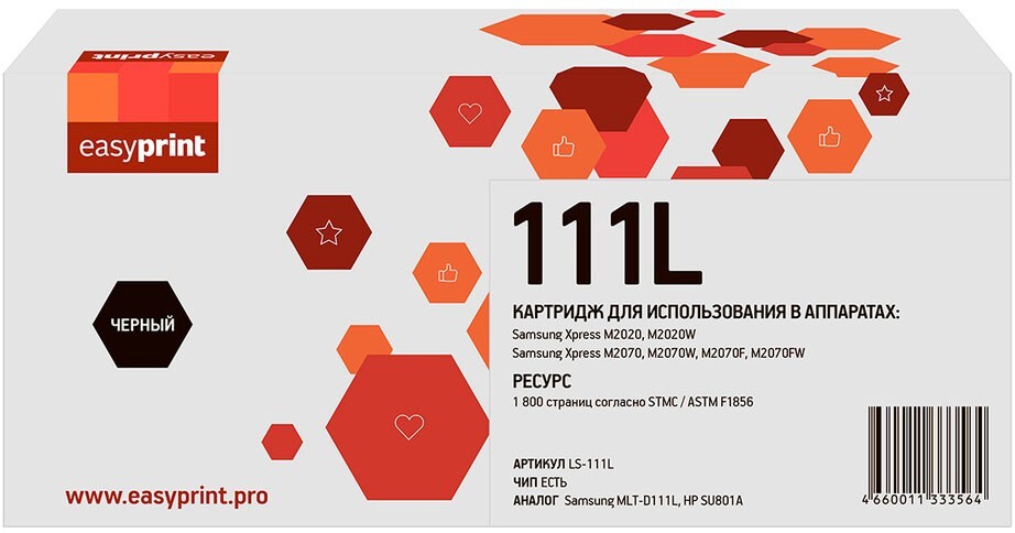 Доставка в 75000 населённых пунктов, ТК СДЭК, Яндекс и Почта РФ Все формы оплаты для физических и юридических лиц! Онлайн конфигураторы ПК и сервера, бесплатная сборка. Гарантия 2 года! Широкий ассортимент комплектующих. Более 30 лет на рынке! ID товара: 397240 Картридж EasyPrint LS-111L Black ОсновныеПроизводитель ........................................................................................................................................................................................................ Код производителя ........................................................................................................................................................................................................ LS-111L Тип ........................................................................................................................................................................................................ Тип печати ........................................................................................................................................................................................................ Тип совместимости ........................................................................................................................................................................................................ Совместимый производитель ........................................................................................................................................................................................................ Samsung Цвет ........................................................................................................................................................................................................ чёрный (black) Совместимость ........................................................................................................................................................................................................ Samsung Xpress SL-M2020, Samsung Xpress SL-M2020W, Samsung Xpress SL-M2070, Samsung Xpress SL-M2070F, Samsung Xpress SL-M2070FW, Samsung Xpress SL-M2070W ДополнительноРесурс ........................................................................................................................................................................................................ 1800 стр. Количество в упаковке ........................................................................................................................................................................................................ 1 шт. Сайт производителя ........................................................................................................................................................................................................ |