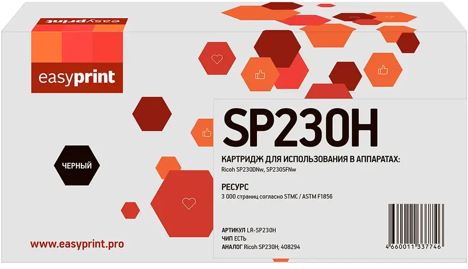 Доставка в 75000 населённых пунктов, ТК СДЭК, Яндекс и Почта РФ Все формы оплаты для физических и юридических лиц! Онлайн конфигураторы ПК и сервера, бесплатная сборка. Гарантия 2 года! Широкий ассортимент комплектующих. Более 30 лет на рынке! ID товара: 397258 Картридж EasyPrint LR-SP230H Black ОсновныеПроизводитель ........................................................................................................................................................................................................ Код производителя ........................................................................................................................................................................................................ LR-SP230H Тип ........................................................................................................................................................................................................ Тип печати ........................................................................................................................................................................................................ Тип совместимости ........................................................................................................................................................................................................ Совместимый производитель ........................................................................................................................................................................................................ Ricoh Цвет ........................................................................................................................................................................................................ чёрный (black) Совместимость ........................................................................................................................................................................................................ Ricoh SP 230DNw, Ricoh SP 230SFNw ДополнительноРесурс ........................................................................................................................................................................................................ 3000 стр. Количество в упаковке ........................................................................................................................................................................................................ 1 шт. Сайт производителя ........................................................................................................................................................................................................ |