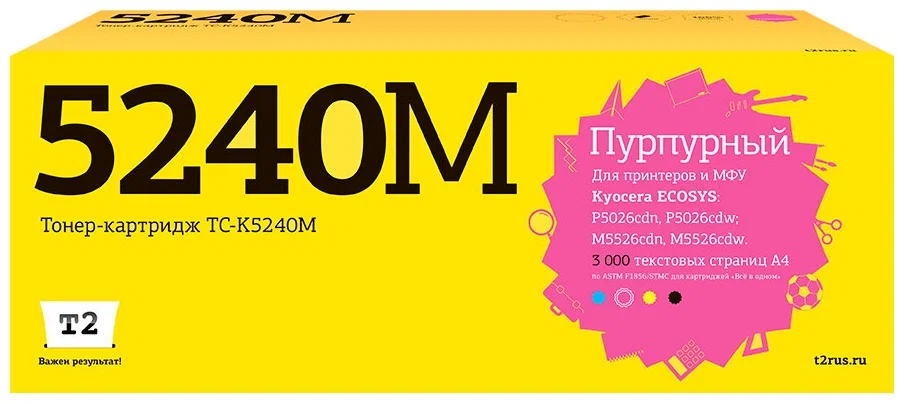 Доставка в 75000 населённых пунктов, ТК СДЭК, Яндекс и Почта РФ Все формы оплаты для физических и юридических лиц! Онлайн конфигураторы ПК и сервера, бесплатная сборка. Гарантия 2 года! Широкий ассортимент комплектующих. Более 30 лет на рынке! ID товара: 398531 Картридж T2 TC-K5240 Magenta ОсновныеПроизводитель ........................................................................................................................................................................................................ Код производителя ........................................................................................................................................................................................................ TC-K5240M Тип ........................................................................................................................................................................................................ Тип печати ........................................................................................................................................................................................................ Тип совместимости ........................................................................................................................................................................................................ Совместимый производитель ........................................................................................................................................................................................................ Kyocera Цвет ........................................................................................................................................................................................................ пурпурный (magenta) Совместимость ........................................................................................................................................................................................................ Kyocera Ecosys M5526cdn, Kyocera Ecosys M5526cdn/a, Kyocera Ecosys M5526cdw, Kyocera Ecosys M5526cdw/a, Kyocera Ecosys P5026cdn, Kyocera Ecosys P5026cdw ДополнительноРесурс ........................................................................................................................................................................................................ 3000 стр. Количество в упаковке ........................................................................................................................................................................................................ 1 шт. Сайт производителя ........................................................................................................................................................................................................ |