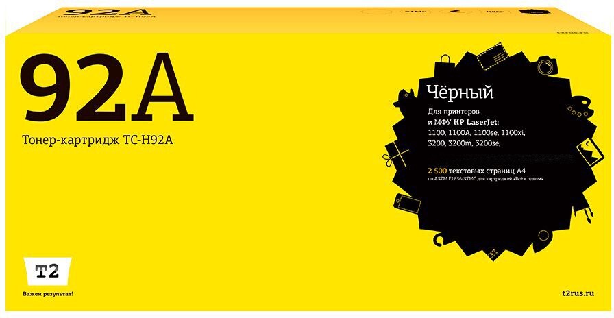 Доставка в 75000 населённых пунктов, ТК СДЭК, Яндекс и Почта РФ Все формы оплаты для физических и юридических лиц! Онлайн конфигураторы ПК и сервера, бесплатная сборка. Гарантия 2 года! Широкий ассортимент комплектующих. Более 30 лет на рынке! 1 170 ₽ ID товара: 398680 Картридж T2 TC-H92A Black ОсновныеПроизводитель ........................................................................................................................................................................................................ Код производителя ........................................................................................................................................................................................................ TC-H92A Тип ........................................................................................................................................................................................................ Тип печати ........................................................................................................................................................................................................ Тип совместимости ........................................................................................................................................................................................................ Совместимый производитель ........................................................................................................................................................................................................ HP Цвет ........................................................................................................................................................................................................ чёрный (black) Совместимость ........................................................................................................................................................................................................ HP LaserJet 1100, HP LaserJet 1100 se, HP LaserJet 1100A, HP LaserJet 1100A xi, HP LaserJet 1100xi, HP LaserJet 3200, HP LaserJet 3200m, HP LaserJet 3200se ДополнительноРесурс ........................................................................................................................................................................................................ 2500 стр. Количество в упаковке ........................................................................................................................................................................................................ 1 шт. Сайт производителя ........................................................................................................................................................................................................ |