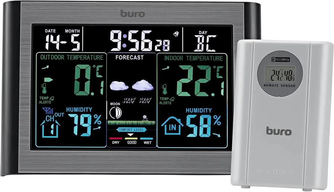 Доставка в 75000 населённых пунктов, ТК СДЭК, Яндекс и Почта РФ Все формы оплаты для физических и юридических лиц! Онлайн конфигураторы ПК и сервера, бесплатная сборка. Гарантия 2 года! Широкий ассортимент комплектующих. Более 30 лет на рынке! 2 240 ₽ ID товара: 439902 Метеостанция Buro BU-WSH114-COLOR ОсновныеПроизводитель ........................................................................................................................................................................................................ Код производителя ........................................................................................................................................................................................................ BU-WSH114-COLOR Тип ........................................................................................................................................................................................................ Измеряемые параметры ........................................................................................................................................................................................................ температура, влажность Функции ........................................................................................................................................................................................................ часы, будильник, календарь, прогноз погоды, уровень комфорта, фаза луны Измерение температуры в помещении ........................................................................................................................................................................................................ до +50 °C Измерение влажности в помещении ........................................................................................................................................................................................................ от 20 до 95 % Измерения вне помещенияВыносной датчик ........................................................................................................................................................................................................ да Измеряемые параметры вне помещения ........................................................................................................................................................................................................ температура, влажность Диапазон температуры вне помещения ........................................................................................................................................................................................................ от -20 до +70 °C Подключение датчика ........................................................................................................................................................................................................ беспроводное Количество датчиков в комплекте ........................................................................................................................................................................................................ 1 Максимальное количество подключаемых датчиков ........................................................................................................................................................................................................ 3 Радиус действия датчика ........................................................................................................................................................................................................ 50 м ДополнительноЗвуковая индикация ........................................................................................................................................................................................................ да Настенное крепление ........................................................................................................................................................................................................ да Дисплей ........................................................................................................................................................................................................ монохромный Подсветка дисплея ........................................................................................................................................................................................................ да Питание ........................................................................................................................................................................................................ от батареек, от сети Элементы питания базовой станции ........................................................................................................................................................................................................ 3х ААА Элементы питания датчика ................................................................................
