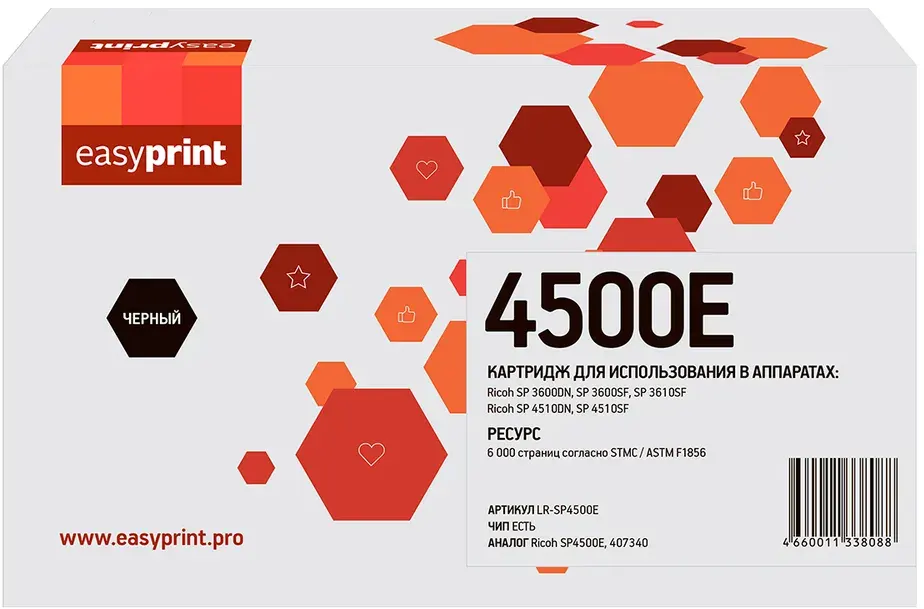 Доставка в 75000 населённых пунктов, ТК СДЭК, Яндекс и Почта РФ Все формы оплаты для физических и юридических лиц! Онлайн конфигураторы ПК и сервера, бесплатная сборка. Гарантия 2 года! Широкий ассортимент комплектующих. Более 30 лет на рынке! 970 ₽ ID товара: 444751 Картридж EasyPrint LR-SP4500E Black ОсновныеПроизводитель ........................................................................................................................................................................................................ Код производителя ........................................................................................................................................................................................................ LR-SP4500E Тип ........................................................................................................................................................................................................ Тип печати ........................................................................................................................................................................................................ Тип совместимости ........................................................................................................................................................................................................ Совместимый производитель ........................................................................................................................................................................................................ Ricoh Цвет ........................................................................................................................................................................................................ чёрный (black) Совместимость ........................................................................................................................................................................................................ Ricoh Aficio SP 4510DN, Ricoh SP 3600DN, Ricoh SP 3600SF, Ricoh SP 3610SF, Ricoh SP 4510SF ДополнительноРесурс ........................................................................................................................................................................................................ 6000 стр. Количество в упаковке ........................................................................................................................................................................................................ 1 шт. Сайт производителя ........................................................................................................................................................................................................ |