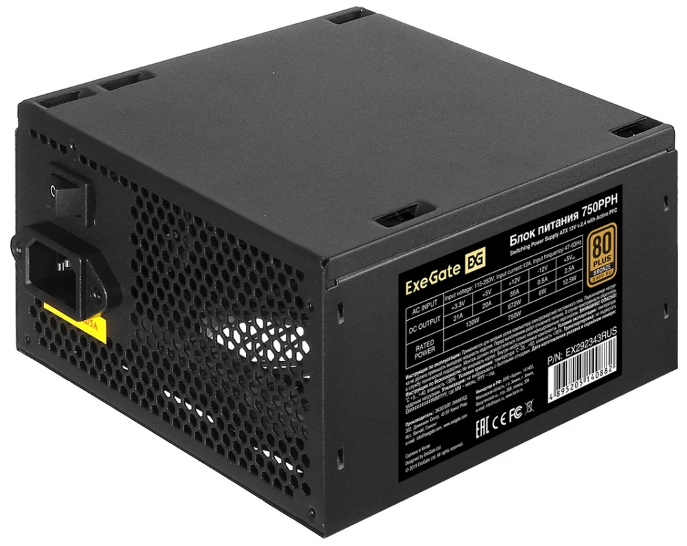 Доставка в 75000 населённых пунктов, ТК СДЭК, Яндекс и Почта РФ Все формы оплаты для физических и юридических лиц! Онлайн конфигураторы ПК и сервера, бесплатная сборка. Гарантия 2 года! Широкий ассортимент комплектующих. Более 30 лет на рынке! 3 210 ₽ ID товара: 46506 Блок питания 750W ExeGate 750PPH (EX292343RUS) ОсновныеПроизводитель ........................................................................................................................................................................................................ Код производителя ........................................................................................................................................................................................................ EX292343RUS Мощность ........................................................................................................................................................................................................ 750 Вт Стандарт ........................................................................................................................................................................................................ PFC ........................................................................................................................................................................................................ Размер вентилятора ........................................................................................................................................................................................................ РазъёмыТип разъёма для материнской платы ........................................................................................................................................................................................................ Количество разъёмов 4+4-pin CPU ........................................................................................................................................................................................................ Количество разъёмов 6+2-pin PCI-E ........................................................................................................................................................................................................ Количество разъёмов 4-pin IDE (Molex) ........................................................................................................................................................................................................ Количество разъёмов 15-pin SATA ........................................................................................................................................................................................................ Сила токаТок по линии +3.3 В ........................................................................................................................................................................................................ 21 A Ток по линии +5 В ........................................................................................................................................................................................................ 20 A Ток по линии +12 В 1 ........................................................................................................................................................................................................ 55 A Ток по линии -12 В ........................................................................................................................................................................................................ 0.5 A Ток по линии +5 В Standby ........................................................................................................................................................................................................ 2.5 A ДополнительноЗащита от перенапряжения ........................................................................................................................................................................................................ да Защита от перегрузки ........................................................................................................................................................................................................ да Защита от короткого замыкания ........................................................................................................................................................................................................ да Сертификат 80 PLUS ........................................................................................................................................................................................................ Цвета, использованные в оформлении ........................................................................................................................................................................................................ чёрный Размеры (ШхВхГ) ........................................................................................................................................................................................................ 150 x 86 x 140 мм Гарантия ...............................