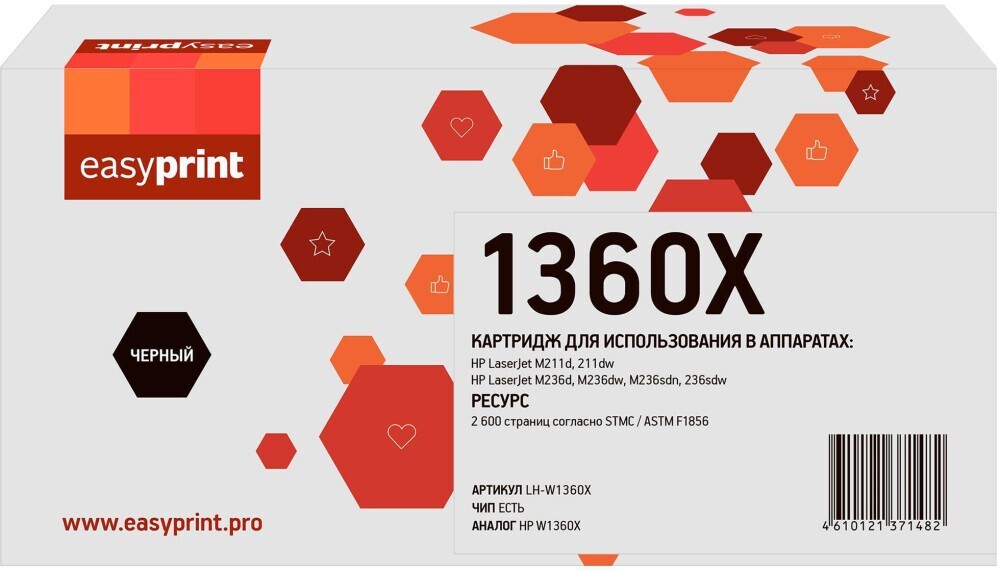 Доставка в 75000 населённых пунктов, ТК СДЭК, Яндекс и Почта РФ Все формы оплаты для физических и юридических лиц! Онлайн конфигураторы ПК и сервера, бесплатная сборка. Гарантия 2 года! Широкий ассортимент комплектующих. Более 30 лет на рынке! 940 ₽ ID товара: 467147 Картридж EasyPrint W1360X Black ОсновныеПроизводитель ........................................................................................................................................................................................................ Код производителя ........................................................................................................................................................................................................ LH-W1360X Тип ........................................................................................................................................................................................................ Тип печати ........................................................................................................................................................................................................ Тип совместимости ........................................................................................................................................................................................................ Совместимый производитель ........................................................................................................................................................................................................ HP Цвет ........................................................................................................................................................................................................ чёрный (black) Совместимость ........................................................................................................................................................................................................ HP LaserJet M209dw (6GW62F), HP LaserJet M211dw (9YF83A), HP LaserJet M232dw (9YF97A), HP LaserJet M232dwc (9YF98A), HP LaserJet M233dw (6GX04A), HP LaserJet M233sdn (6GX05A), HP LaserJet M233sdw (6GX06A), HP LaserJet M234dw (6GW99F/9YF91F), HP LaserJet M234sdn (6GX00F/9YG02F), HP LaserJet M234sdw (6GX01F/9YG05F), HP LaserJet M236dw (9YF95A), HP LaserJet M236sdn (9YG08A) ДополнительноРесурс ........................................................................................................................................................................................................ 2600 стр. Количество в упаковке ........................................................................................................................................................................................................ 1 шт. Сайт производителя ........................................................................................................................................................................................................ |