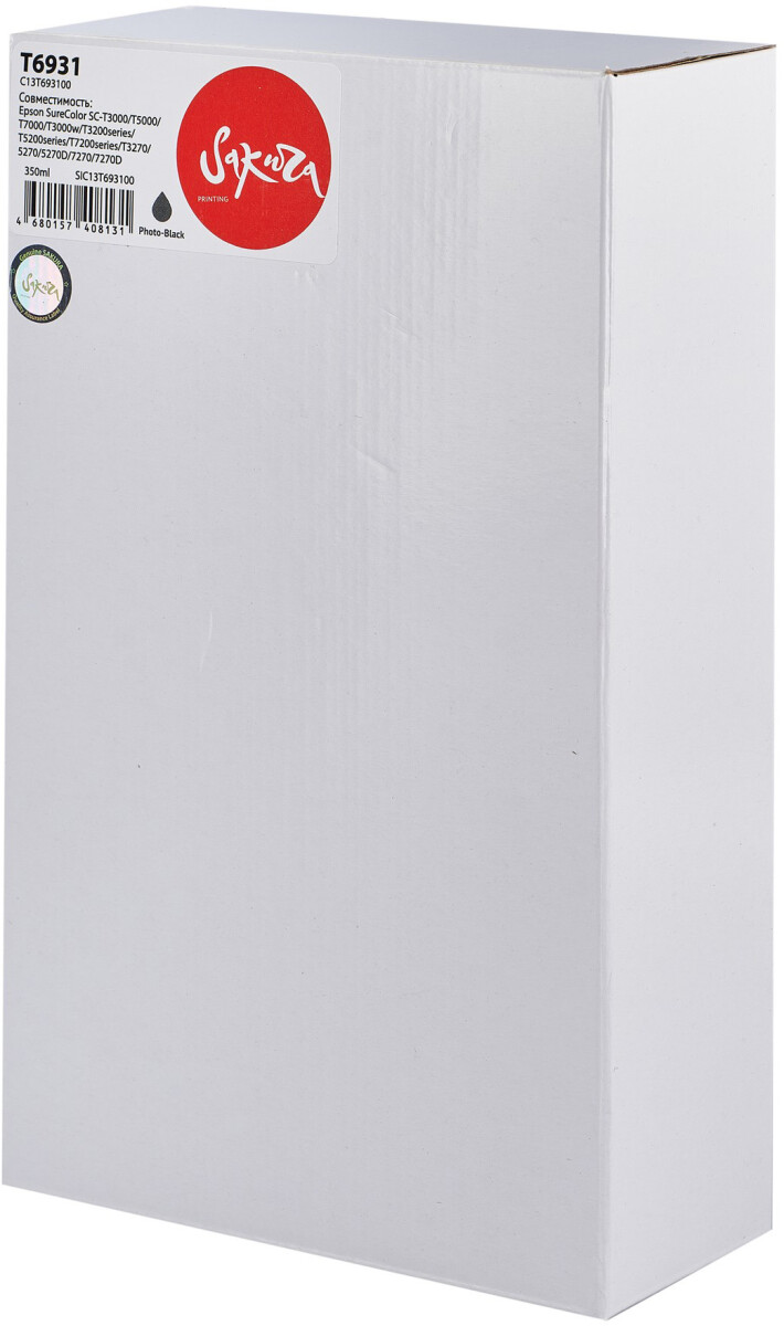 Доставка в 75000 населённых пунктов, ТК СДЭК, Яндекс и Почта РФ Все формы оплаты для физических и юридических лиц! Онлайн конфигураторы ПК и сервера, бесплатная сборка. Гарантия 2 года! Широкий ассортимент комплектующих. Более 30 лет на рынке! 3 820 ₽ ID товара: 535404 Картридж Sakura SIC13T693100 Photo Black ОсновныеПроизводитель ........................................................................................................................................................................................................ Код производителя ........................................................................................................................................................................................................ SIC13T693100 Тип ........................................................................................................................................................................................................ Тип печати ........................................................................................................................................................................................................ Тип совместимости ........................................................................................................................................................................................................ Совместимый производитель ........................................................................................................................................................................................................ Epson Цвет ........................................................................................................................................................................................................ фото чёрный (photo black) Совместимость ........................................................................................................................................................................................................ Epson SureColor SC-T3000, Epson SureColor SC-T3200 (без стенда), Epson SureColor SC-T3200 (со стендом), Epson SureColor SC-T3200N, Epson SureColor SC-T5000, Epson SureColor SC-T5200, Epson SureColor SC-T5200D, Epson SureColor SC-T7000, Epson SureColor SC-T7200, Epson SureColor SC-T7200D ДополнительноЁмкость ........................................................................................................................................................................................................ 350 мл Количество в упаковке ........................................................................................................................................................................................................ 1 шт. Сайт производителя ........................................................................................................................................................................................................ |