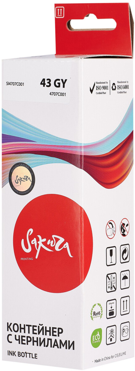 Доставка в 35000 населённых пунктов, ТК СДЭК и Boxberry Все формы оплаты для физических и юридических лиц! Онлайн конфигуратор ПК, бесплатная сборка. Гарантия 2 года! Широкий ассортимент комплектующих. Более 30 лет на рынке! 320 ₽ ID товара: 535433 Чернила Sakura SI4707C001 Grey ОсновныеПроизводитель ........................................................................................................................................................................................................ Код производителя ........................................................................................................................................................................................................ SI4707C001 Тип ........................................................................................................................................................................................................ Тип печати ........................................................................................................................................................................................................ Тип совместимости ........................................................................................................................................................................................................ Совместимый производитель ........................................................................................................................................................................................................ Canon Цвет ........................................................................................................................................................................................................ серый (grey) Совместимость ........................................................................................................................................................................................................ Canon PIXMA G540, Canon PIXMA G640 (4620C009) ДополнительноЁмкость ........................................................................................................................................................................................................ 60 мл Количество в упаковке ........................................................................................................................................................................................................ 1 шт. Сайт производителя ........................................................................................................................................................................................................ |