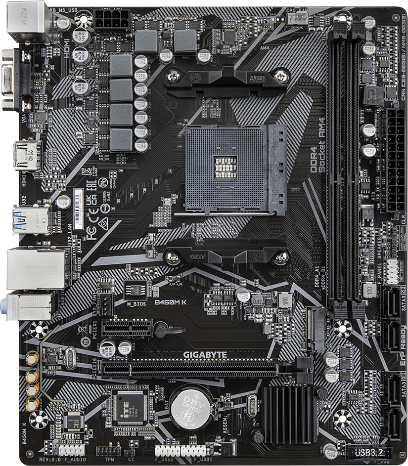 Доставка в 75000 населённых пунктов, ТК СДЭК, Яндекс и Почта РФ Все формы оплаты для физических и юридических лиц! Онлайн конфигураторы ПК и сервера, бесплатная сборка. Гарантия 2 года! Широкий ассортимент комплектующих. Более 30 лет на рынке! ID товара: 656375 Материнская плата Gigabyte B450M K 2.0 ОсновныеПроизводитель ........................................................................................................................................................................................................ Код производителя ........................................................................................................................................................................................................ B450M K 2.0 Сокет ........................................................................................................................................................................................................ Чипсет ........................................................................................................................................................................................................ ПамятьТип памяти ........................................................................................................................................................................................................ Количество слотов памяти ........................................................................................................................................................................................................ Дисковые контроллерыКонтроллер SATA ........................................................................................................................................................................................................ 4 x SATA-III (6 Гб/с) Поддержка RAID ........................................................................................................................................................................................................ 0, 1, 10 Слоты расширенияСлоты расширения ........................................................................................................................................................................................................ PCI-E 3.0 x16, PCI-E x1, PCI-E M.2 Тип слотов M.2 ........................................................................................................................................................................................................ Socket 3, M key, 2280 (SATA & PCIe 3.0 x4/x2) Аудио/ВидеоИнтегрированное видео ........................................................................................................................................................................................................ Звук ........................................................................................................................................................................................................ Аудио-контроллер ........................................................................................................................................................................................................ СетьСетевой интерфейс ........................................................................................................................................................................................................ Gigabit Ethernet (1 Гбит/с) Сетевой контроллер ........................................................................................................................................................................................................ Realtek ИнтерфейсыРазъёмы на задней панели ........................................................................................................................................................................................................ 2 x PS/2, 2 x USB 2.0, 4 x USB 3.2 Gen1, VGA, HDMI, RJ-45 ДополнительноРазъёмы для подключения вентиляторов корпуса ........................................................................................................................................................................................................ 4-pin Разъём питания ATX 12 В ........................................................................................................................................................................................................ 8-pin Внутренние разъёмы USB на плате ........................................................................................................................................................................................................ 2 x USB 2.0, USB 3.2 Gen1 Форм-фактор ........................................................................................................................................................................................................ Тип поставки ........................................................................................................................................................................................................ Цвета, использованные в оформлении .................................................................................