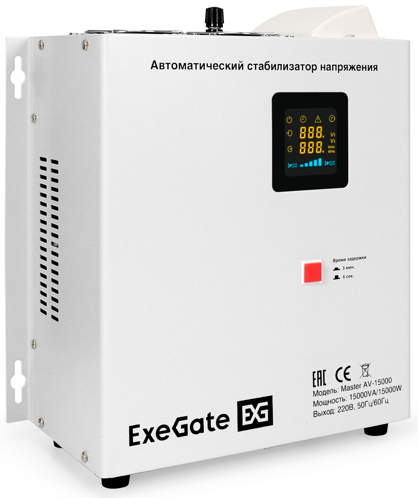 Доставка в 75000 населённых пунктов, ТК СДЭК, Яндекс и Почта РФ Все формы оплаты для физических и юридических лиц! Онлайн конфигураторы ПК и сервера, бесплатная сборка. Гарантия 2 года! Широкий ассортимент комплектующих. Более 30 лет на рынке! ID товара: 683219 Стабилизатор напряжения ExeGate Master AV-15000 ОсновныеПроизводитель ........................................................................................................................................................................................................ Код производителя ........................................................................................................................................................................................................ EX291764RUS Тип стабилизатора ........................................................................................................................................................................................................ Полная выходная мощность ........................................................................................................................................................................................................ 15000 ВА Активная выходная мощность ........................................................................................................................................................................................................ 15000 Вт Время переключения ........................................................................................................................................................................................................ 7 мс КПД ........................................................................................................................................................................................................ 98 % Тип входного напряжения ........................................................................................................................................................................................................ однофазное Входное напряжение ........................................................................................................................................................................................................ 140-260 В Выходное напряжение ........................................................................................................................................................................................................ 220 В, ±8% Способ установки ........................................................................................................................................................................................................ Разъёмы и функциональностьТип выходных разъёмов питания ........................................................................................................................................................................................................ Индикатор включения ........................................................................................................................................................................................................ да Охлаждение ........................................................................................................................................................................................................ активное Дисплей/шкала (вольтметр, амперметр) ........................................................................................................................................................................................................ да Защита от перегрузок ........................................................................................................................................................................................................ да Защита от перегрева ........................................................................................................................................................................................................ да Защита от короткого замыкания ........................................................................................................................................................................................................ да ДополнительноДополнительная информация ........................................................................................................................................................................................................ Температура окр. среды: 0...+40 °С; влажность: от 10% до 102% Размеры (ШхВхГ) ........................................................................................................................................................................................................ 312 x 310 x 167 мм Вес ........................................................................................................................................................................................................ 20.5 кг Гарантия .........................................................................................