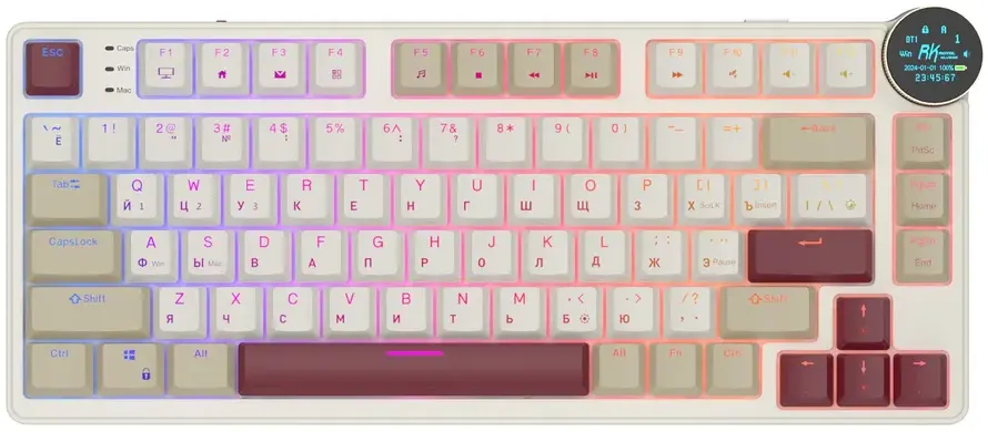 Доставка в 75000 населённых пунктов, ТК СДЭК, Яндекс и Почта РФ Все формы оплаты для физических и юридических лиц! Онлайн конфигуратор ПК, бесплатная сборка. Гарантия 2 года! Широкий ассортимент комплектующих. Более 30 лет на рынке! 10 180 ₽ ID товара: 702993 Клавиатура Royal Kludge N80 Rosy Clouds (Brown Switch) ОсновныеПроизводитель ........................................................................................................................................................................................................ Код производителя ........................................................................................................................................................................................................ 6977576550687 Тип устройства ........................................................................................................................................................................................................ клавиатура Тип соединения ........................................................................................................................................................................................................ Интерфейс подключения ........................................................................................................................................................................................................ Bluetooth (без адаптера), USB Тип беспроводной связи ........................................................................................................................................................................................................ Bluetooth/радиоканал Размер клавиатуры ........................................................................................................................................................................................................ Тип клавиатуры ........................................................................................................................................................................................................ Конструкция ........................................................................................................................................................................................................ игровая Тип переключателей ........................................................................................................................................................................................................ Royal Kludge RK Brown Формат клавиатуры ........................................................................................................................................................................................................ ANSI Количество клавиш ........................................................................................................................................................................................................ 80 Тип пластика кейкапов ........................................................................................................................................................................................................ PBT Тонкая клавиатура ........................................................................................................................................................................................................ да Hot Swap ........................................................................................................................................................................................................ да Подсветка клавиш клавиатуры ........................................................................................................................................................................................................ да Цвет подсветки ........................................................................................................................................................................................................ RGB Встроенный USB-хаб ........................................................................................................................................................................................................ да, 1x USB Type-C Тип питания ........................................................................................................................................................................................................ аккумулятор, 3750 мАч ДополнительноЦвет ........................................................................................................................................................................................................ бежевый, розовый Дополнительная информация ........................................................................................................................................................................................................ поворотный тумблер регулировки звука, режимов работы и подсветки, многофункциональный экран Размеры (ШхВхГ) ...........................................................................................