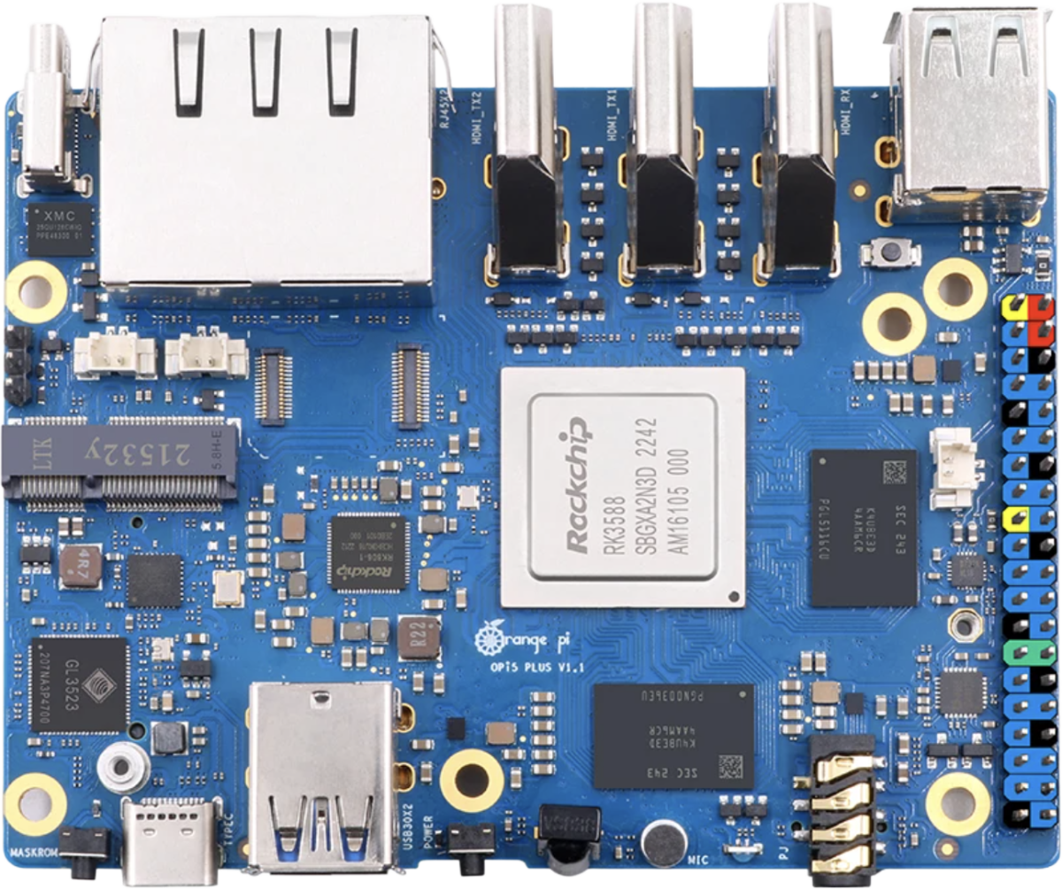 Доставка в 75000 населённых пунктов, ТК СДЭК, Яндекс и Почта РФ Все формы оплаты для физических и юридических лиц! Онлайн конфигураторы ПК и сервера, бесплатная сборка. Гарантия 2 года! Широкий ассортимент комплектующих. Более 30 лет на рынке! 33 950 ₽ ID товара: 716653 Одноплатный компьютер Orange Pi 5 Plus 16Gb ОсновныеПроизводитель ........................................................................................................................................................................................................ Код производителя ........................................................................................................................................................................................................ Pi 5 Plus 16GB Тип ........................................................................................................................................................................................................ Поддерживаемые ОС ........................................................................................................................................................................................................ Android, Debian, Orangepi OS (Arch), Orangepi OS (Droid), Ubuntu ПроцессорМодель ........................................................................................................................................................................................................ Тактовая частота ........................................................................................................................................................................................................ 1800 МГц Количество ядер ........................................................................................................................................................................................................ Графический чипсет ........................................................................................................................................................................................................ Производительность (NPU) ........................................................................................................................................................................................................ до 6 TOPS Оперативная памятьОбъём установленной памяти ........................................................................................................................................................................................................ Тип памяти ........................................................................................................................................................................................................ Накопители данныхОбъём eMMC накопителя ........................................................................................................................................................................................................ Свободные слоты для накопителей ........................................................................................................................................................................................................ M.2 2280 PCIe 3.0x4, eMMC Socket Слот для карт памяти ........................................................................................................................................................................................................ СетьСетевой интерфейс ........................................................................................................................................................................................................ 2 x 2.5 Gigabit Ethernet Стандарт Wi-Fi ........................................................................................................................................................................................................ Стандарт Bluetooth ........................................................................................................................................................................................................ Разъёмы и интерфейсыВнешние разъёмы ........................................................................................................................................................................................................ 2 x USB-A 2.0 (480 Мбит/с), 2 x USB-A 3.2 Gen1 (5 Гбит/с), USB-C 3.2 Gen1 (5 Гбит/с), 2 x HDMI 2.1 (выход), HDMI (вход), Jack 3.5 мм (микрофон/аудио) Внутренние разъёмы ........................................................................................................................................................................................................ FAN, FPC, GPIO 40-pin, MIPI CSI, MIPI DSI, RTC, UART Питание и температураПитание ........................................................................................................................................................................................................ USB-C PD ДополнительноЭлементы управления (кнопки) ..........................................................................................................................................
