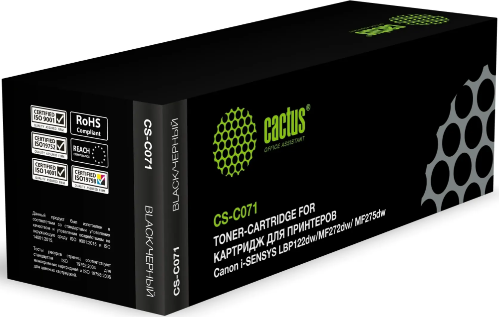Доставка в 75000 населённых пунктов, ТК СДЭК, Яндекс и Почта РФ Все формы оплаты для физических и юридических лиц! Онлайн конфигураторы ПК и сервера, бесплатная сборка. Гарантия 2 года! Широкий ассортимент комплектующих. Более 30 лет на рынке! 1 200 ₽ ID товара: 717889 Картридж Cactus CS-C071 Black ОсновныеПроизводитель ........................................................................................................................................................................................................ Код производителя ........................................................................................................................................................................................................ CS-C071 Тип ........................................................................................................................................................................................................ Тип печати ........................................................................................................................................................................................................ Тип совместимости ........................................................................................................................................................................................................ Совместимый производитель ........................................................................................................................................................................................................ Canon Цвет ........................................................................................................................................................................................................ чёрный (black) Совместимость ........................................................................................................................................................................................................ Canon i-SENSYS LBP122dw, Canon i-SENSYS MF272dw (5621C013), Canon i-SENSYS MF275dw (5621C001) ДополнительноРесурс ........................................................................................................................................................................................................ 1200 стр. Количество в упаковке ........................................................................................................................................................................................................ 1 шт. Сайт производителя ........................................................................................................................................................................................................ |