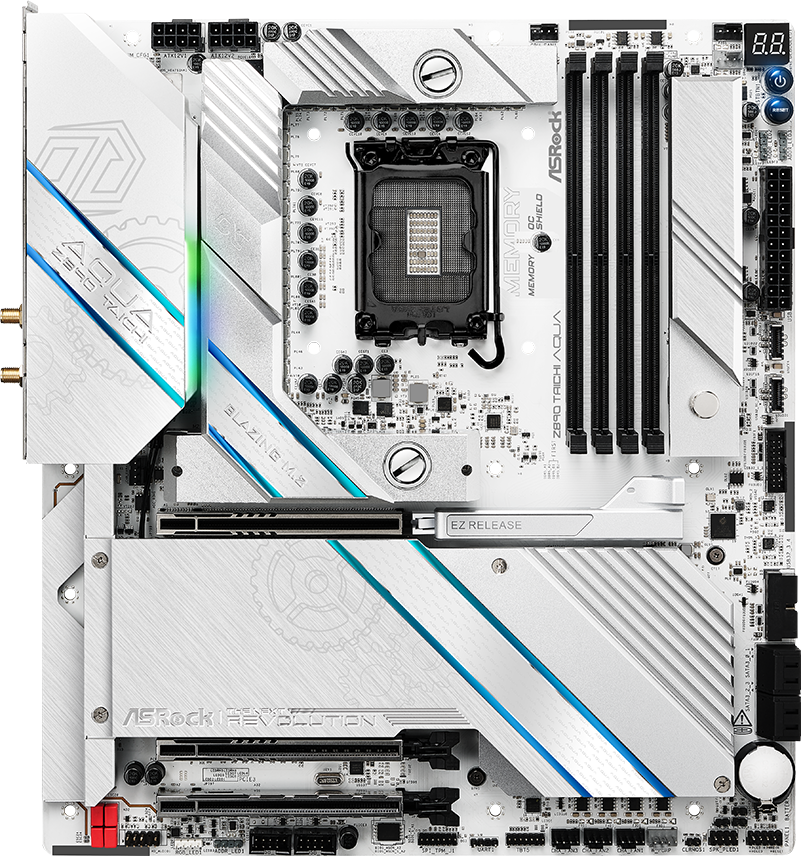 Доставка в 75000 населённых пунктов, ТК СДЭК, Яндекс и Почта РФ Все формы оплаты для физических и юридических лиц! Онлайн конфигураторы ПК и сервера, бесплатная сборка. Гарантия 2 года! Широкий ассортимент комплектующих. Более 30 лет на рынке! ID товара: 727752 Материнская плата ASRock Z890 Taichi AQUA ОсновныеПроизводитель ........................................................................................................................................................................................................ Код производителя ........................................................................................................................................................................................................ Z890 Taichi AQUA Сокет ........................................................................................................................................................................................................ Чипсет ........................................................................................................................................................................................................ ПамятьТип памяти ........................................................................................................................................................................................................ Количество слотов памяти ........................................................................................................................................................................................................ Поддержка ........................................................................................................................................................................................................ Intel XMP Дисковые контроллерыКонтроллер SATA ........................................................................................................................................................................................................ 4 x SATA-III (6 Гб/с) Поддержка RAID ........................................................................................................................................................................................................ 0, 1, 5, 10 Слоты расширенияСлоты расширения ........................................................................................................................................................................................................ 2 x PCI-E 5.0 x16, PCI-E 4.0 x16, 6 x PCI-E M.2 Тип слотов M.2 ........................................................................................................................................................................................................ - Key M, 2280 (PCIe Gen5x4); - Key M, 2280 (PCIe Gen5x4); - Key M, 2280 (PCIe Gen4x4); - Key M, 2280 (PCIe Gen4x4); - Key M, 2280 (PCIe Gen4x4); - Key M, 2242/2260/2280 (SATA3 & PCIe Gen4x4). Поддерживаемые режимы PCI-Express ........................................................................................................................................................................................................ x16 или x8/x8, x4 Аудио/ВидеоИнтегрированное видео ........................................................................................................................................................................................................ Звук ........................................................................................................................................................................................................ Аудио-контроллер ........................................................................................................................................................................................................ СетьСетевой интерфейс ........................................................................................................................................................................................................ 10 Gigabit Ethernet (10 Гбит/с), Wi-Fi, Bluetooth Сетевой контроллер ........................................................................................................................................................................................................ Marvell AQC113 Версия Wi-Fi ........................................................................................................................................................................................................ 7 Версия Bluetooth ........................................................................................................................................................................................................ 5.4 ИнтерфейсыРазъёмы на задней панели ........................................................................................................................................................................................................ 4 x USB 3.2 Gen1 Type-C, 4 x USB 3.2 Gen2 Type-C, 2 x Thunderbolt 4/USB-C, 2 x RJ-45, S/PDIF (оптический) ДополнительноКоличество фаз питания ..............................................................................................................................................................