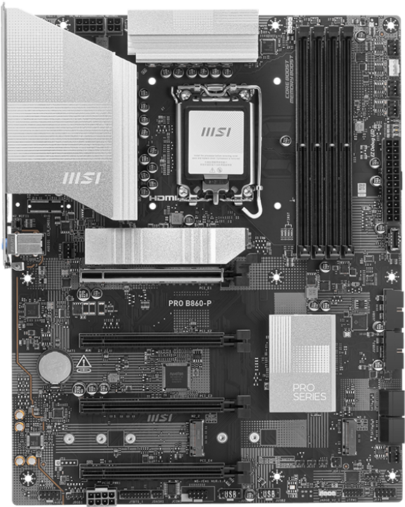 Доставка в 75000 населённых пунктов, ТК СДЭК, Яндекс и Почта РФ Все формы оплаты для физических и юридических лиц! Онлайн конфигураторы ПК и сервера, бесплатная сборка. Гарантия 2 года! Широкий ассортимент комплектующих. Более 30 лет на рынке! 19 320 ₽ ID товара: 728674 Материнская плата MSI PRO B860-P ОсновныеПроизводитель ........................................................................................................................................................................................................ Код производителя ........................................................................................................................................................................................................ PRO B860-P Сокет ........................................................................................................................................................................................................ Чипсет ........................................................................................................................................................................................................ ПамятьТип памяти ........................................................................................................................................................................................................ Количество слотов памяти ........................................................................................................................................................................................................ Поддержка ........................................................................................................................................................................................................ Intel XMP Дисковые контроллерыКонтроллер SATA ........................................................................................................................................................................................................ 4 x SATA-III (6 Гб/с) Поддержка RAID ........................................................................................................................................................................................................ 0, 1, 5, 10 Слоты расширенияСлоты расширения ........................................................................................................................................................................................................ PCI-E 5.0 x16, 3 x PCI-E 4.0 x16, 3 x PCI-E M.2 Тип слотов M.2 ........................................................................................................................................................................................................ - Key M, 2280/2260 (PCIe 5.0 x4); - Key M, 2280/2260/2242 (PCIe 4.0 x4); - Key M, 2280/2260 (PCIe 4.0 x2). Поддерживаемые режимы PCI-Express ........................................................................................................................................................................................................ x16/x1/x4/x1 Аудио/ВидеоИнтегрированное видео ........................................................................................................................................................................................................ Звук ........................................................................................................................................................................................................ Аудио-контроллер ........................................................................................................................................................................................................ СетьСетевой интерфейс ........................................................................................................................................................................................................ 5 Gigabit Ethernet (5 Гбит/с) Сетевой контроллер ........................................................................................................................................................................................................ Realtek RTL8126 ИнтерфейсыРазъёмы на задней панели ........................................................................................................................................................................................................ 4 x USB 2.0, 2 x USB 3.2 Gen1, 2 x USB 3.2 Gen2, HDMI, DisplayPort, Thunderbolt 4/USB-C, RJ-45 ДополнительноКоличество фаз питания ........................................................................................................................................................................................................ Радиатор на подсистеме питания (мосфетах) ........................................................................................................................................................................................................ да Разъёмы для подключения вентиляторов корпуса ................................................................................................................................................................................