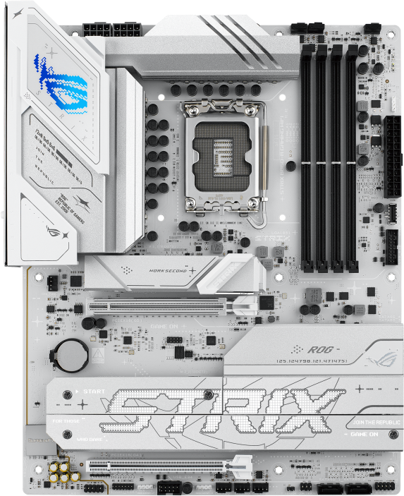 Доставка в 35000 населённых пунктов, ТК СДЭК и Boxberry Все формы оплаты для физических и юридических лиц! Онлайн конфигуратор ПК, бесплатная сборка. Гарантия 2 года! Широкий ассортимент комплектующих. Более 30 лет на рынке! 23 150 ₽ ID товара: 728810 Материнская плата ASUS ROG STRIX B860-A GAMING WIFI ОсновныеПроизводитель ........................................................................................................................................................................................................ Код производителя ........................................................................................................................................................................................................ ROG STRIX B860-A GAMING WIFI Socket ........................................................................................................................................................................................................ Чипсет ........................................................................................................................................................................................................ ПамятьТип памяти ........................................................................................................................................................................................................ Количество слотов памяти ........................................................................................................................................................................................................ Поддержка ........................................................................................................................................................................................................ Intel XMP Дисковые контроллерыКонтроллер SATA ........................................................................................................................................................................................................ 4 x SATA-III (6 Гб/с) Поддержка RAID ........................................................................................................................................................................................................ 0, 1, 5, 10 Слоты расширенияСлоты расширения ........................................................................................................................................................................................................ PCI-E 5.0 x16, PCI-E 4.0 x16, 4 x PCI-E M.2 Тип слотов M.2 ........................................................................................................................................................................................................ - Key M, 2242/2260/2280 (PCIe 5.0 x4); - Key M, 2280 (PCIe 4.0 x4); - Key M, 2280/22110 (PCIe 4.0 x4); - Key M, 2280 (PCIe 4.0 x4). Поддерживаемые режимы PCI-Express ........................................................................................................................................................................................................ x16/x4 Аудио/ВидеоИнтегрированное видео ........................................................................................................................................................................................................ Звук ........................................................................................................................................................................................................ Аудио-контроллер ........................................................................................................................................................................................................ СетьСетевой интерфейс ........................................................................................................................................................................................................ 2.5 Gigabit Ethernet (2.5 Гбит/с), Wi-Fi, Bluetooth Сетевой контроллер ........................................................................................................................................................................................................ Intel Версия Wi-Fi ........................................................................................................................................................................................................ 7 Версия Bluetooth ........................................................................................................................................................................................................ 5.4 ИнтерфейсыРазъёмы на задней панели ........................................................................................................................................................................................................ 4 x USB 2.0, 2 x USB 3.2 Gen1, 2 x USB 3.2 Gen2, USB 3.2 Gen2 Type-C, USB 3.2 Gen2x2 Type-C, HDMI, DisplayPort, RJ-45, S/PDIF (оптический) ДополнительноКоличество фаз питания ........................................................................................................................................................................................................ Радиатор на