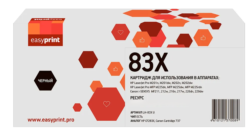 Доставка в 75000 населённых пунктов, ТК СДЭК, Яндекс и Почта РФ Все формы оплаты для физических и юридических лиц! Онлайн конфигураторы ПК и сервера, бесплатная сборка. Гарантия 2 года! Широкий ассортимент комплектующих. Более 30 лет на рынке! ID товара: 73355 Картридж EasyPrint LH-83X Black ОсновныеПроизводитель ........................................................................................................................................................................................................ Код производителя ........................................................................................................................................................................................................ LH-83X Тип ........................................................................................................................................................................................................ Тип печати ........................................................................................................................................................................................................ Тип совместимости ........................................................................................................................................................................................................ Совместимый производитель ........................................................................................................................................................................................................ HP Цвет ........................................................................................................................................................................................................ чёрный (black) Совместимость ........................................................................................................................................................................................................ Canon i-SENSYS MF211, Canon i-SENSYS MF212w, Canon i-SENSYS MF216n, Canon i-SENSYS MF217w, Canon i-SENSYS MF226dn, Canon i-SENSYS MF229dw, HP LaserJet Pro M125r (CZ176A), HP LaserJet Pro M125ra (CZ177A), HP LaserJet Pro M125rnw (CZ178A), HP LaserJet Pro M127fs (CZ187A), HP LaserJet Pro M127fw (CZ183A), HP LaserJet Pro M201d (CF466A), HP LaserJet Pro M201dw (CF456A), HP LaserJet Pro M201n (CF455A), HP LaserJet Pro M225dn (CF484A), HP LaserJet Pro M225rdn (CF486A), HP LaserJet Pro MFP M225dw (CF485A) ДополнительноРесурс ........................................................................................................................................................................................................ 2200 стр. Количество в упаковке ........................................................................................................................................................................................................ 1 шт. Сайт производителя ........................................................................................................................................................................................................ |
