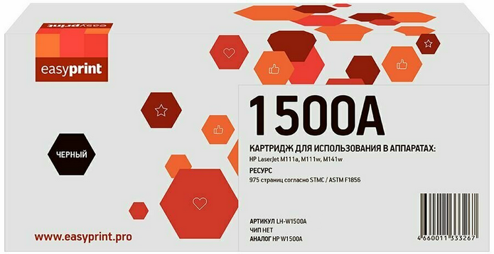 Доставка в 75000 населённых пунктов, ТК СДЭК, Яндекс и Почта РФ Все формы оплаты для физических и юридических лиц! Онлайн конфигураторы ПК и сервера, бесплатная сборка. Гарантия 2 года! Широкий ассортимент комплектующих. Более 30 лет на рынке! 920 ₽ ID товара: 735819 Картридж EasyPrint LH-W1500A Black ОсновныеПроизводитель ........................................................................................................................................................................................................ Код производителя ........................................................................................................................................................................................................ LH-W1500A Тип ........................................................................................................................................................................................................ Тип печати ........................................................................................................................................................................................................ Тип совместимости ........................................................................................................................................................................................................ Совместимый производитель ........................................................................................................................................................................................................ HP Цвет ........................................................................................................................................................................................................ чёрный (black) Совместимость ........................................................................................................................................................................................................ HP LaserJet M111a (7MD67A), HP LaserJet M111w (7MD68A), HP LaserJet M141w (7MD74A) ДополнительноРесурс ........................................................................................................................................................................................................ 975 стр. Количество в упаковке ........................................................................................................................................................................................................ 1 шт. Сайт производителя ........................................................................................................................................................................................................ |
