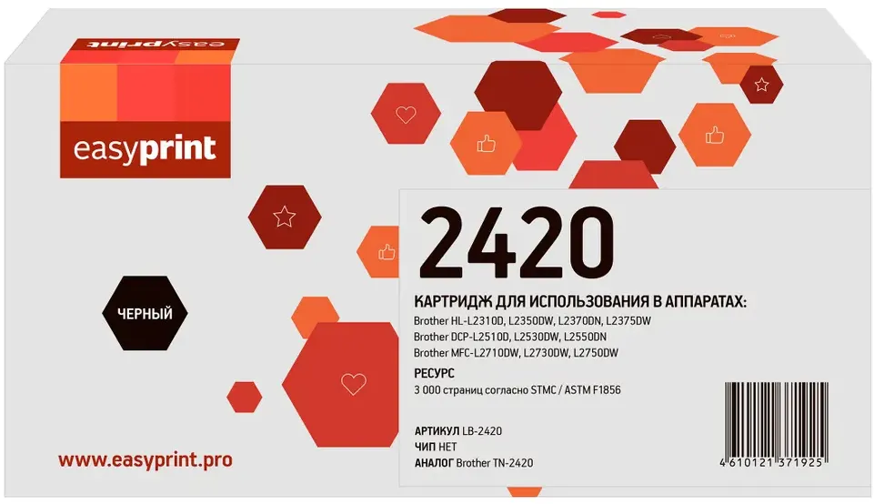 Доставка в 35000 населённых пунктов, ТК СДЭК и Boxberry Все формы оплаты для физических и юридических лиц! Онлайн конфигуратор ПК, бесплатная сборка. Гарантия 2 года! Широкий ассортимент комплектующих. Более 30 лет на рынке! 690 ₽ ID товара: 736778 Картридж EasyPrint LB-2420 Black ОсновныеПроизводитель ........................................................................................................................................................................................................ Код производителя ........................................................................................................................................................................................................ LB-2420 Тип ........................................................................................................................................................................................................ Тип печати ........................................................................................................................................................................................................ Тип совместимости ........................................................................................................................................................................................................ Совместимый производитель ........................................................................................................................................................................................................ Brother Цвет ........................................................................................................................................................................................................ чёрный (black) Совместимость ........................................................................................................................................................................................................ Brother DCP-L2510D, Brother DCP-L2530DW, Brother HL-L2310D, Brother HL-L2350DW, Brother HL-L2370DN, Brother MFC-L2710DN, Brother MFC-L2710DW, Brother MFC-L2730DW, Brother MFC-L2750DW ДополнительноРесурс ........................................................................................................................................................................................................ 3000 стр. Количество в упаковке ........................................................................................................................................................................................................ 1 шт. Сайт производителя ........................................................................................................................................................................................................ |