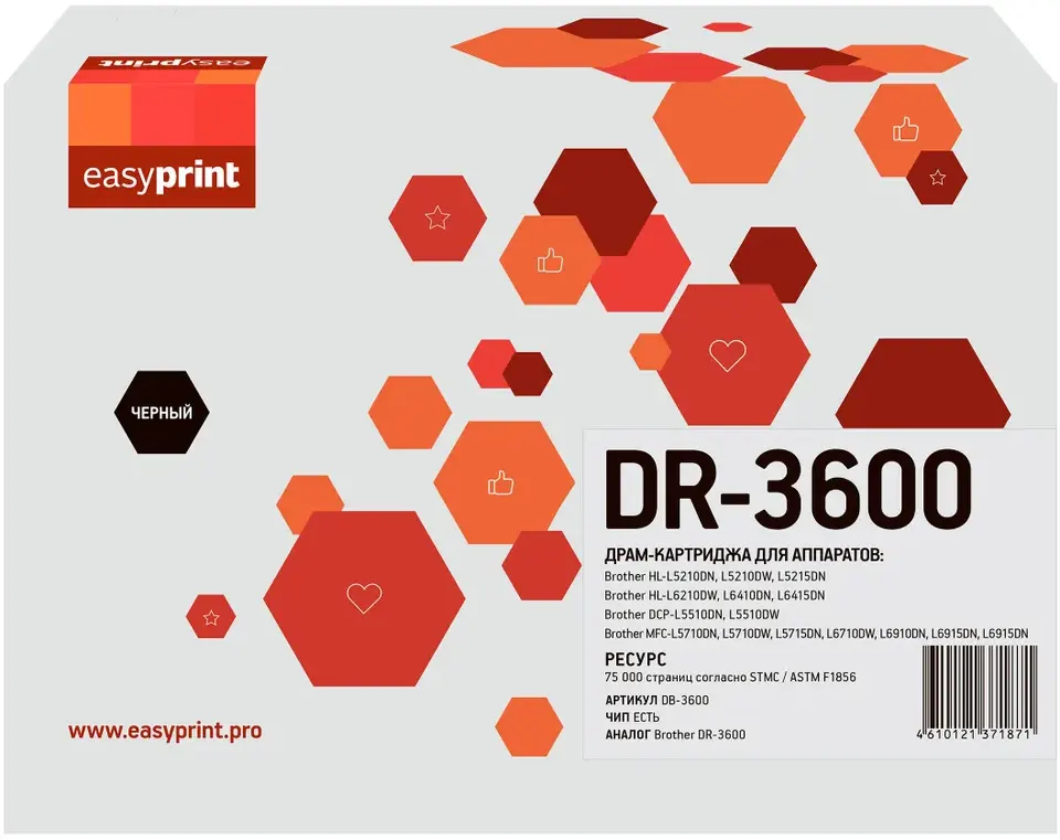 Доставка в 75000 населённых пунктов, ТК СДЭК, Яндекс и Почта РФ Все формы оплаты для физических и юридических лиц! Онлайн конфигураторы ПК и сервера, бесплатная сборка. Гарантия 2 года! Широкий ассортимент комплектующих. Более 30 лет на рынке! 1 200 ₽ ID товара: 736779 Фотобарабан EasyPrint DB-3600 Black ОсновныеПроизводитель ........................................................................................................................................................................................................ Код производителя ........................................................................................................................................................................................................ DB-3600 Тип ........................................................................................................................................................................................................ Тип печати ........................................................................................................................................................................................................ Тип совместимости ........................................................................................................................................................................................................ Совместимый производитель ........................................................................................................................................................................................................ Brother Цвет ........................................................................................................................................................................................................ чёрный (black) Совместимость ........................................................................................................................................................................................................ Brother DCP-L5510DW, Brother HL-L5210DN, Brother HL-L5210DW, Brother HL-L6210DW, Brother HL-L6410DN, Brother HL-L6415DN, Brother MFC-L5710DN, Brother MFC-L5710DW, Brother MFC-L6710DW, Brother MFC-L6910DN, Brother MFC-L6915DN ДополнительноРесурс ........................................................................................................................................................................................................ 75000 стр. Количество в упаковке ........................................................................................................................................................................................................ 1 шт. Сайт производителя ........................................................................................................................................................................................................ |