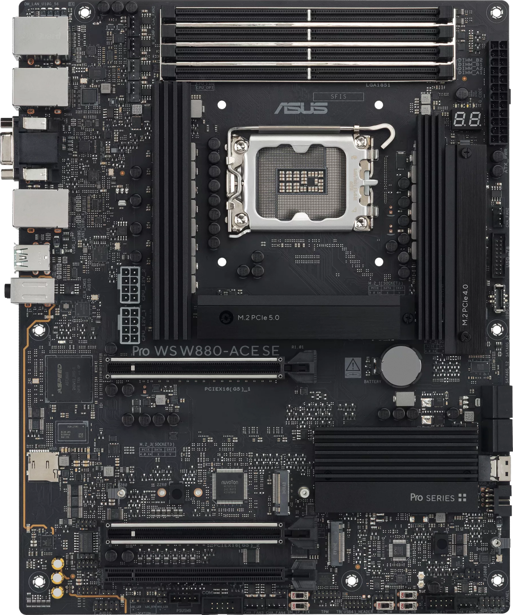 Доставка в 35000 населённых пунктов, ТК СДЭК и Boxberry Все формы оплаты для физических и юридических лиц! Онлайн конфигуратор ПК, бесплатная сборка. Гарантия 2 года! Широкий ассортимент комплектующих. Более 30 лет на рынке! 61 960 ₽ ID товара: 750716 Серверная материнская плата ASUS PRO WS W880-ACE SE ОсновныеПроизводитель ........................................................................................................................................................................................................ Код производителя ........................................................................................................................................................................................................ PRO WS W880-ACE SE Socket ........................................................................................................................................................................................................ Количество сокетов ........................................................................................................................................................................................................ Поддерживаемые процессоры ........................................................................................................................................................................................................ Core Ultra 9, Core Ultra 7, Core Ultra 5 Чипсет ........................................................................................................................................................................................................ ПамятьТип памяти ........................................................................................................................................................................................................ Поддержка ECC ........................................................................................................................................................................................................ Количество слотов памяти ........................................................................................................................................................................................................ Поддержка частот ........................................................................................................................................................................................................ 8200 МГц, 8400 МГц, 8600 МГц, 9066 МГц Максимальный объём памяти ........................................................................................................................................................................................................ Дисковые контроллеры и слоты расширенияДисковые контроллеры ........................................................................................................................................................................................................ 4 x SATA-III (6 Гб/с), SlimSAS Поддержка RAID ........................................................................................................................................................................................................ 0, 1, 5, 10 Слоты расширения ........................................................................................................................................................................................................ 2 x PCI-E 5.0 x16, PCI-E 4.0 x16, 4 x M.2 Интерфейс M.2 ........................................................................................................................................................................................................ PCI-E, SATA Размер M.2 ........................................................................................................................................................................................................ 2280 Аудио/видеоЗвук ........................................................................................................................................................................................................ да СетьСетевой интерфейс ........................................................................................................................................................................................................ 2 x 2.5 Gigabit Ethernet (2.5 Гбит/с) ПодключениеРазъёмы на задней панели ........................................................................................................................................................................................................ 6 x USB 3.2 Gen 2, USB Type-C, Thunderbolt 4/USB Type-C, VGA, HDMI, 3 x RJ-45 Основной разъём питания ........................................................................................................................................................................................................ 24-pin Разъём питания процессора ........................................................................................................................................................................................................ 8-pin + 8-pin ДополнительноФорм-фактор ....................................................