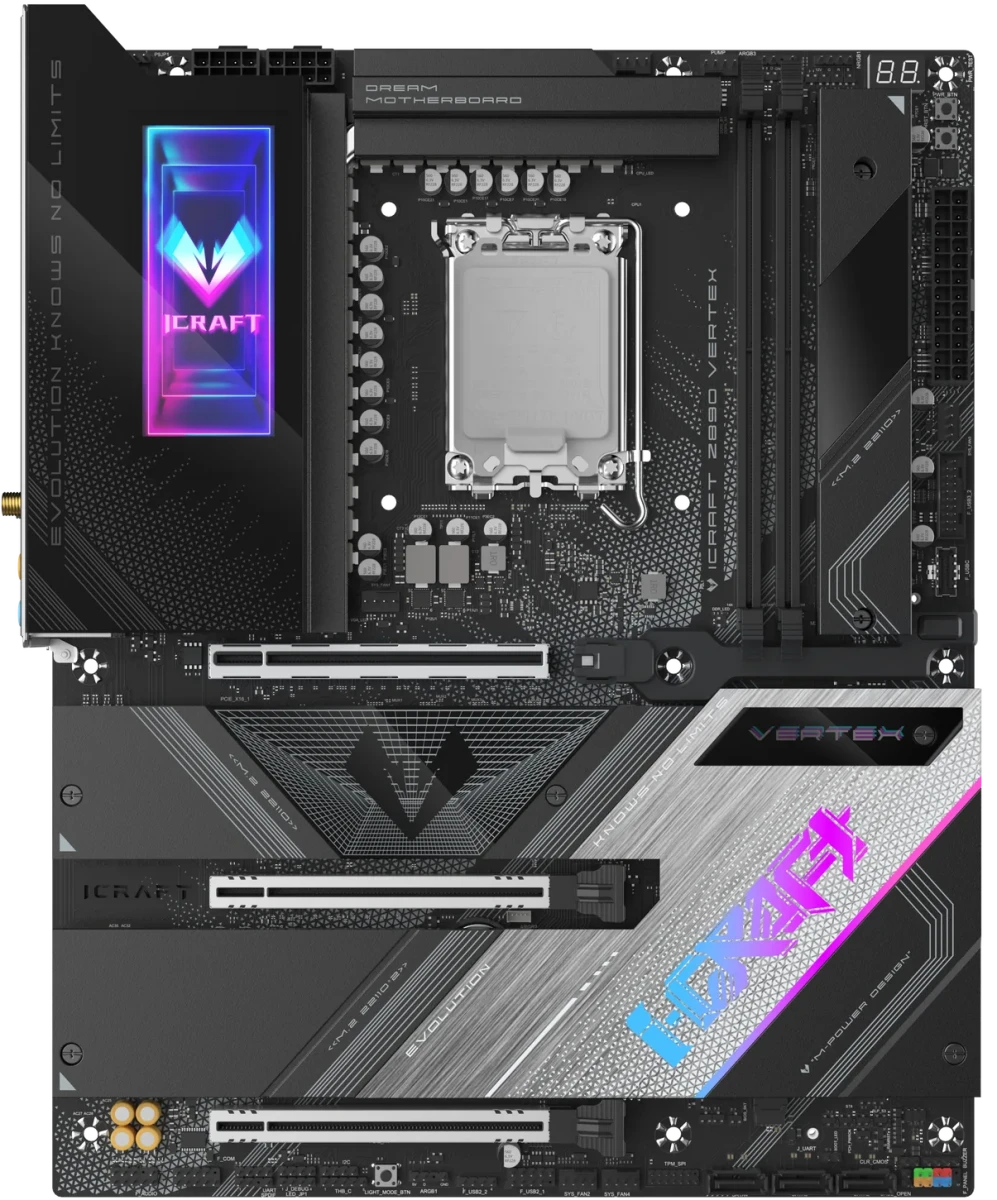 | Доставка в 75000 населённых  пунктов, ТК СДЭК, Яндекс и Почта РФ Все формы оплаты для  физических и юридических лиц! Онлайн конфигуратор ПК,  бесплатная сборка. Гарантия 2 года! Широкий ассортимент  комплектующих. Более 30 лет на рынке! 25 990 ₽ ID товара: 760430 Материнская плата Maxsun iCraft Z890 VERTEX ОсновныеПроизводитель  ........................................................................................................................................................................................................ Код производителя  ........................................................................................................................................................................................................ MS-iCraft Z890 VERTEX Socket  ........................................................................................................................................................................................................ Чипсет  ........................................................................................................................................................................................................ ПамятьТип памяти  ........................................................................................................................................................................................................ Количество слотов памяти  ........................................................................................................................................................................................................ Максимальный объём поддерживаемой памяти  ........................................................................................................................................................................................................ 96 Гб Поддержка  ........................................................................................................................................................................................................ Intel XMP Дисковые контроллерыКонтроллер SATA  ........................................................................................................................................................................................................ 4 x SATA-III (6 Гб/с) Поддержка RAID  ........................................................................................................................................................................................................ нет Слоты расширенияСлоты расширения  ........................................................................................................................................................................................................ PCI-E 5.0 x16, 2 x PCI-E x16, 4 x PCI-E M.2 Тип слотов M.2  ........................................................................................................................................................................................................ Key M, 2242/2260/2280/22110 (PCIe 5.0 x4); 3x Key M, 2242/2260/2280/22110 (PCIe 4.0 x4) Поддерживаемые режимы PCI-Express  ........................................................................................................................................................................................................ x8 + x8, x8 + x4 + x4 Аудио/ВидеоИнтегрированное видео  ........................................................................................................................................................................................................ Звук  ........................................................................................................................................................................................................ Аудио-контроллер  ........................................................................................................................................................................................................ СетьСетевой интерфейс  ........................................................................................................................................................................................................ 5 Gigabit Ethernet (5 Гбит/с), Wi-Fi, Bluetooth Сетевой контроллер  ........................................................................................................................................................................................................ Realtek RTL8126 Версия Wi-Fi  ........................................................................................................................................................................................................ 7 Версия Bluetooth  ........................................................................................................................................................................................................ 5.4 ИнтерфейсыРазъёмы на задней панели  ........................................................................................................................................................................................................ 9 x USB 3.2 Gen1, USB 3.2 Gen1 Type-C, USB 3.2 Gen2 Type-C, HDMI, DisplayPort, RJ-45, S/PDIF (опти