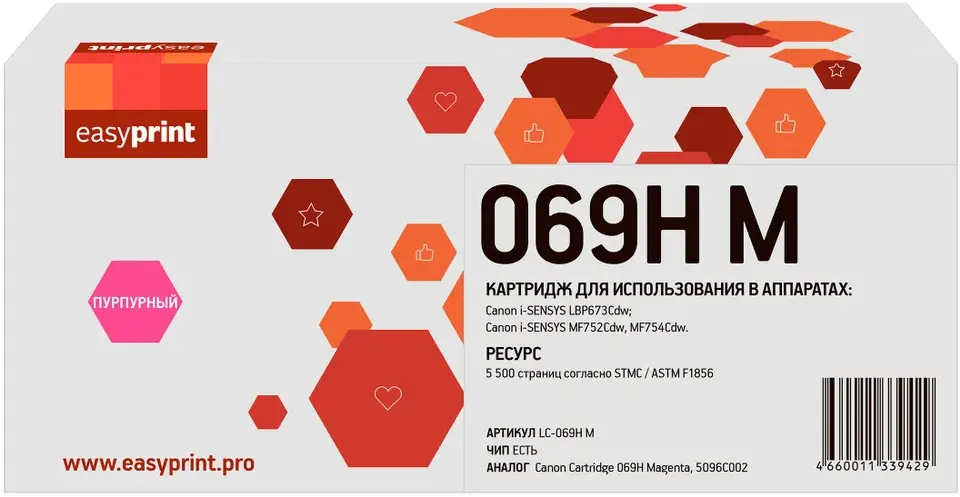 Доставка в 75000 населённых пунктов, ТК СДЭК, Яндекс и Почта РФ Все формы оплаты для физических и юридических лиц! Онлайн конфигуратор ПК, бесплатная сборка. Гарантия 2 года! Широкий ассортимент комплектующих. Более 30 лет на рынке! 1 830 ₽ ID товара: 760957 Картридж EasyPrint LC-069H Magenta ОсновныеПроизводитель ........................................................................................................................................................................................................ Код производителя ........................................................................................................................................................................................................ LC-069H M Тип ........................................................................................................................................................................................................ Тип печати ........................................................................................................................................................................................................ Тип совместимости ........................................................................................................................................................................................................ Совместимый производитель ........................................................................................................................................................................................................ Canon Цвет ........................................................................................................................................................................................................ пурпурный (magenta) Совместимость ........................................................................................................................................................................................................ Canon i-SENSYS LBP673Cdw (5456C007), Canon i-SENSYS MF752Cdw (5455C012), Canon i-SENSYS MF754Cdw (5455C009) ДополнительноРесурс ........................................................................................................................................................................................................ 5500 стр. Количество в упаковке ........................................................................................................................................................................................................ 1 шт. Сайт производителя ........................................................................................................................................................................................................ |