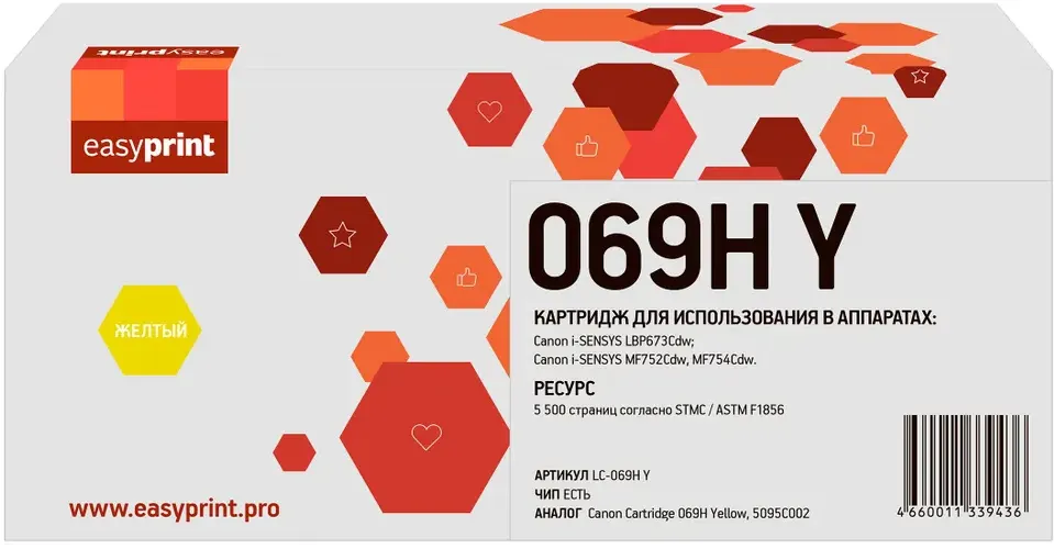 Доставка в 75000 населённых пунктов, ТК СДЭК, Яндекс и Почта РФ Все формы оплаты для физических и юридических лиц! Онлайн конфигураторы ПК и сервера, бесплатная сборка. Гарантия 2 года! Широкий ассортимент комплектующих. Более 30 лет на рынке! 1 880 ₽ ID товара: 760958 Картридж EasyPrint LC-069H Yellow ОсновныеПроизводитель ........................................................................................................................................................................................................ Код производителя ........................................................................................................................................................................................................ LC-069H Y Тип ........................................................................................................................................................................................................ Тип печати ........................................................................................................................................................................................................ Тип совместимости ........................................................................................................................................................................................................ Совместимый производитель ........................................................................................................................................................................................................ Canon Цвет ........................................................................................................................................................................................................ жёлтый (yellow) Совместимость ........................................................................................................................................................................................................ Canon i-SENSYS LBP673Cdw (5456C007), Canon i-SENSYS MF752Cdw (5455C012), Canon i-SENSYS MF754Cdw (5455C009) ДополнительноРесурс ........................................................................................................................................................................................................ 5500 стр. Количество в упаковке ........................................................................................................................................................................................................ 1 шт. Сайт производителя ........................................................................................................................................................................................................ |