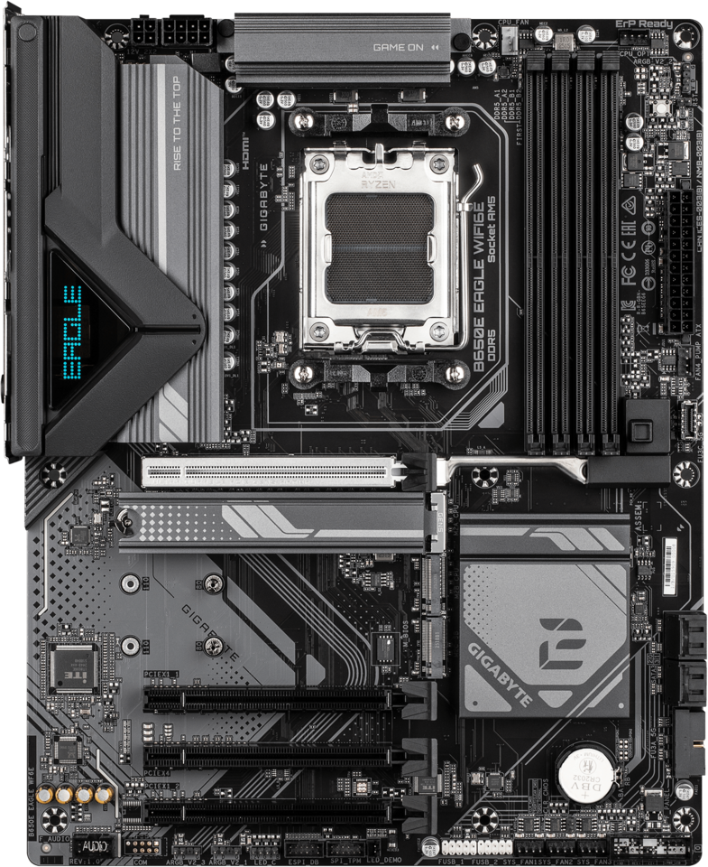 Доставка в 75000 населённых пунктов, ТК СДЭК, Яндекс и Почта РФ Все формы оплаты для физических и юридических лиц! Онлайн конфигураторы ПК и сервера, бесплатная сборка. Гарантия 2 года! Широкий ассортимент комплектующих. Более 30 лет на рынке! 17 870 ₽ ID товара: 764484 Материнская плата Gigabyte B650E EAGLE WIFI6E ОсновныеПроизводитель ........................................................................................................................................................................................................ Код производителя ........................................................................................................................................................................................................ B650E EAGLE WIFI6E Сокет ........................................................................................................................................................................................................ Чипсет ........................................................................................................................................................................................................ ПамятьТип памяти ........................................................................................................................................................................................................ Количество слотов памяти ........................................................................................................................................................................................................ Максимальный объём поддерживаемой памяти ........................................................................................................................................................................................................ 256 Гб Поддержка ........................................................................................................................................................................................................ AMD EXPO, Intel XMP Дисковые контроллерыКонтроллер SATA ........................................................................................................................................................................................................ 4 x SATA-III (6 Гб/с) Поддержка RAID ........................................................................................................................................................................................................ 0, 1, 10 Слоты расширенияСлоты расширения ........................................................................................................................................................................................................ PCI-E 5.0 x16, PCI-E 4.0 x16, 2 x PCI-E 3.0 x16, 3 x PCI-E M.2 Тип слотов M.2 ........................................................................................................................................................................................................ - Socket 3, M key, 22110/2280 (PCIe 5.0 x4/x2); - Socket 3, M key, 22110/2280 (PCIe 4.0 x4/x2); - Socket 3, M key, 22110/2280 (PCIe 4.0 x2). Поддерживаемые режимы PCI-Express ........................................................................................................................................................................................................ x16/x4/x4/x1 Аудио/ВидеоИнтегрированное видео ........................................................................................................................................................................................................ Звук ........................................................................................................................................................................................................ Аудио-контроллер ........................................................................................................................................................................................................ СетьСетевой интерфейс ........................................................................................................................................................................................................ 2.5 Gigabit Ethernet (2.5 Гбит/с), Wi-Fi, Bluetooth Сетевой контроллер ........................................................................................................................................................................................................ Realtek Версия Wi-Fi ........................................................................................................................................................................................................ 6E Версия Bluetooth ........................................................................................................................................................................................................ 5.3 ИнтерфейсыРазъёмы на задней панели ........................................................................................................................................................................................................ PS/2, 4 x USB 2.0, 2 x USB 3.2 Gen1, USB 3.2 Gen1 Type-C, 2 x USB 3.2 Gen2, HD