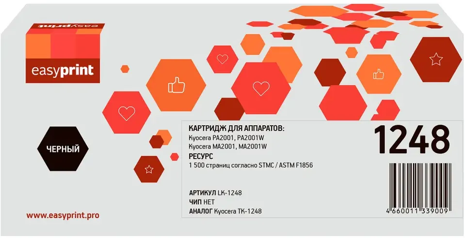 Доставка в 75000 населённых пунктов, ТК СДЭК, Яндекс и Почта РФ Все формы оплаты для физических и юридических лиц! Онлайн конфигураторы ПК и сервера, бесплатная сборка. Гарантия 2 года! Широкий ассортимент комплектующих. Более 30 лет на рынке! 690 ₽ ID товара: 768299 Картридж EasyPrint LK-1248 Black ОсновныеПроизводитель ........................................................................................................................................................................................................ Код производителя ........................................................................................................................................................................................................ LK-1248 Тип ........................................................................................................................................................................................................ Тип печати ........................................................................................................................................................................................................ Тип совместимости ........................................................................................................................................................................................................ Совместимый производитель ........................................................................................................................................................................................................ Kyocera Цвет ........................................................................................................................................................................................................ чёрный (black) Совместимость ........................................................................................................................................................................................................ Kyocera Ecosys MA2001, Kyocera Ecosys MA2001W, Kyocera PA2001, Kyocera PA2001w ДополнительноРесурс ........................................................................................................................................................................................................ 1500 стр. Количество в упаковке ........................................................................................................................................................................................................ 1 шт. Сайт производителя ........................................................................................................................................................................................................ |
