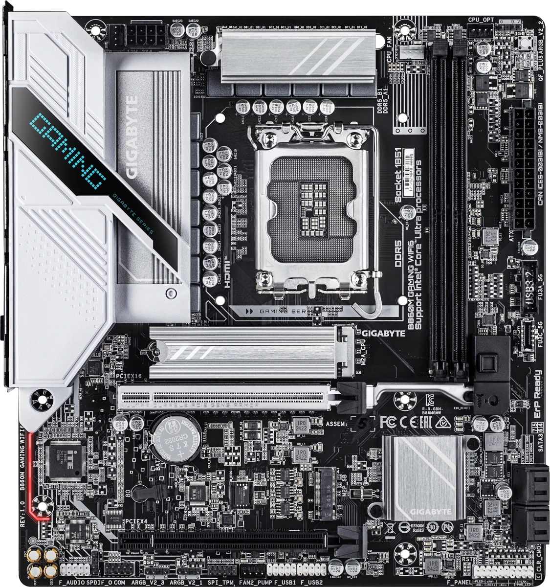 Доставка в 75000 населённых пунктов, ТК СДЭК, Яндекс и Почта РФ Все формы оплаты для физических и юридических лиц! Онлайн конфигураторы ПК и сервера, бесплатная сборка. Гарантия 2 года! Широкий ассортимент комплектующих. Более 30 лет на рынке! 16 830 ₽ ID товара: 775740 Материнская плата Gigabyte B860M GAMING WIFI6 ОсновныеПроизводитель ........................................................................................................................................................................................................ Код производителя ........................................................................................................................................................................................................ B860M GAMING WIFI6 Сокет ........................................................................................................................................................................................................ Чипсет ........................................................................................................................................................................................................ ПамятьТип памяти ........................................................................................................................................................................................................ Количество слотов памяти ........................................................................................................................................................................................................ Максимальный объём поддерживаемой памяти ........................................................................................................................................................................................................ 128 Гб Поддержка ........................................................................................................................................................................................................ Intel XMP Дисковые контроллерыКонтроллер SATA ........................................................................................................................................................................................................ 4 x SATA-III (6 Гб/с) Поддержка RAID ........................................................................................................................................................................................................ 0, 1, 5, 10 Слоты расширенияСлоты расширения ........................................................................................................................................................................................................ PCI-E 5.0 x16, PCI-E 4.0 x16, 2 x PCI-E M.2 Тип слотов M.2 ........................................................................................................................................................................................................ 2280 (PCI-E 5.0 x4), 2280 (PCI-E 4.0 x4) Поддерживаемые режимы PCI-Express ........................................................................................................................................................................................................ x16/x4 Аудио/ВидеоИнтегрированное видео ........................................................................................................................................................................................................ Звук ........................................................................................................................................................................................................ Аудио-контроллер ........................................................................................................................................................................................................ СетьСетевой интерфейс ........................................................................................................................................................................................................ 2.5 Gigabit Ethernet (2.5 Гбит/с), Wi-Fi, Bluetooth Сетевой контроллер ........................................................................................................................................................................................................ Realtek Версия Wi-Fi ........................................................................................................................................................................................................ 6 Версия Bluetooth ........................................................................................................................................................................................................ 5.3 ИнтерфейсыРазъёмы на задней панели ........................................................................................................................................................................................................ PS/2, 3 x USB 2.0, 3 x USB 3.2 Gen1, HDMI, DisplayPort, RJ-45 ДополнительноКоличество фаз питания ................................................................................