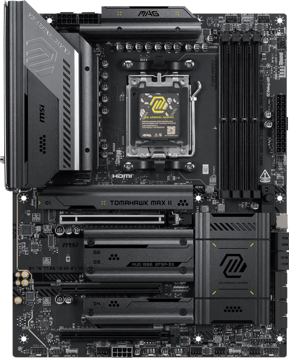 Доставка в 75000 населённых пунктов, ТК СДЭК, Яндекс и Почта РФ Все формы оплаты для физических и юридических лиц! Онлайн конфигураторы ПК и сервера, бесплатная сборка. Гарантия 2 года! Широкий ассортимент комплектующих. Более 30 лет на рынке! 27 470 ₽ ID товара: 776389 Материнская плата MSI MAG B850 TOMAHAWK MAX WIFI II ОсновныеПроизводитель ........................................................................................................................................................................................................ Код производителя ........................................................................................................................................................................................................ MAG B850 TOMAHAWK MAX WIFI II Сокет ........................................................................................................................................................................................................ Чипсет ........................................................................................................................................................................................................ ПамятьТип памяти ........................................................................................................................................................................................................ Количество слотов памяти ........................................................................................................................................................................................................ Максимальный объём поддерживаемой памяти ........................................................................................................................................................................................................ 256 Гб Поддержка ........................................................................................................................................................................................................ AMD EXPO Дисковые контроллерыКонтроллер SATA ........................................................................................................................................................................................................ 4 x SATA-III (6 Гб/с) Слоты расширенияСлоты расширения ........................................................................................................................................................................................................ PCI-E 5.0 x16, PCI-E 4.0 x16, PCI-E 3.0 x16, 4 x PCI-E M.2 Тип слотов M.2 ........................................................................................................................................................................................................ 2260/2280 (PCI-E 5.0 x4), 2280/22110 (PCI-E 5.0 x4), 2260/2280 (PCI-E 4.0 x2), 2260/2280 (PCI-E 4.0 x4) Поддерживаемые режимы PCI-Express ........................................................................................................................................................................................................ x16/x4/x1 Аудио/ВидеоИнтегрированное видео ........................................................................................................................................................................................................ Звук ........................................................................................................................................................................................................ Аудио-контроллер ........................................................................................................................................................................................................ СетьСетевой интерфейс ........................................................................................................................................................................................................ 5 Gigabit Ethernet (5 Гбит/с), Wi-Fi, Bluetooth Сетевой контроллер ........................................................................................................................................................................................................ Realtek RTL8126VB Слот M.2 (E Key) ........................................................................................................................................................................................................ да Версия Wi-Fi ........................................................................................................................................................................................................ 7, модуль Wi-Fi 7 поддерживается только в Microsoft Windows 11 версии 24H2 или более поздних Версия Bluetooth ........................................................................................................................................................................................................ 5.4, модуль Bluetooth 5.4 поддерживается только в Microsoft Windows 11 версии 24H2 ИнтерфейсыРазъёмы на задней панели ....................................................................
