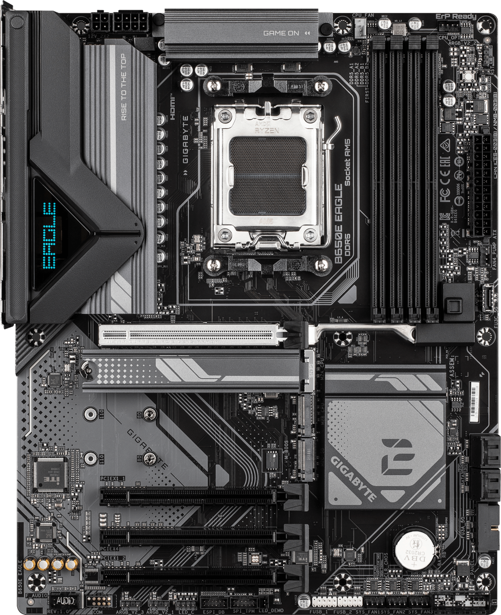 Доставка в 75000 населённых пунктов, ТК СДЭК, Яндекс и Почта РФ Все формы оплаты для физических и юридических лиц! Онлайн конфигураторы ПК и сервера, бесплатная сборка. Гарантия 2 года! Широкий ассортимент комплектующих. Более 30 лет на рынке! 15 950 ₽ ID товара: 777588 Материнская плата Gigabyte B650E EAGLE ОсновныеПроизводитель ........................................................................................................................................................................................................ Код производителя ........................................................................................................................................................................................................ B650E EAGLE Сокет ........................................................................................................................................................................................................ Чипсет ........................................................................................................................................................................................................ ПамятьТип памяти ........................................................................................................................................................................................................ Количество слотов памяти ........................................................................................................................................................................................................ Максимальный объём поддерживаемой памяти ........................................................................................................................................................................................................ 256 Гб Поддержка ........................................................................................................................................................................................................ AMD EXPO, Intel XMP Дисковые контроллерыКонтроллер SATA ........................................................................................................................................................................................................ 4 x SATA-III (6 Гб/с) Поддержка RAID ........................................................................................................................................................................................................ 0, 1, 10 Слоты расширенияСлоты расширения ........................................................................................................................................................................................................ PCI-E 5.0 x16, PCI-E 4.0 x16, 2 x PCI-E 3.0 x16, 3 x PCI-E M.2 Тип слотов M.2 ........................................................................................................................................................................................................ 2280/22110 (PCI-E 5.0 x4), 2280/22110 (PCI-E 4.0 x2), 2280/22110 (PCI-E 4.0 x4) Поддерживаемые режимы PCI-Express ........................................................................................................................................................................................................ x16/x4/x1/x1 Аудио/ВидеоИнтегрированное видео ........................................................................................................................................................................................................ Звук ........................................................................................................................................................................................................ Аудио-контроллер ........................................................................................................................................................................................................ СетьСетевой интерфейс ........................................................................................................................................................................................................ 2.5 Gigabit Ethernet (2.5 Гбит/с) Сетевой контроллер ........................................................................................................................................................................................................ Realtek ИнтерфейсыРазъёмы на задней панели ........................................................................................................................................................................................................ PS/2, 4 x USB 2.0, 2 x USB 3.2 Gen1, USB 3.2 Gen1 Type-C, 2 x USB 3.2 Gen2, HDMI, DisplayPort, RJ-45 ДополнительноКоличество фаз питания ........................................................................................................................................................................................................ Радиатор на подсистеме питания (мосфетах) ..............................................................................................................................................................................