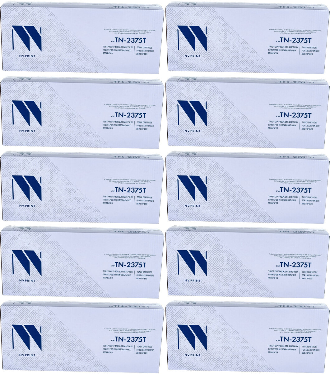 Доставка в 75000 населённых пунктов, ТК СДЭК, Яндекс и Почта РФ Все формы оплаты для физических и юридических лиц! Онлайн конфигураторы ПК и сервера, бесплатная сборка. Гарантия 2 года! Широкий ассортимент комплектующих. Более 30 лет на рынке! 3 750 ₽ ID товара: 777612 Картридж NV Print TN2375T-SET10 Black ОсновныеПроизводитель ........................................................................................................................................................................................................ Код производителя ........................................................................................................................................................................................................ NV-TN-2375T-SET10 Тип ........................................................................................................................................................................................................ Тип печати ........................................................................................................................................................................................................ Тип совместимости ........................................................................................................................................................................................................ Совместимый производитель ........................................................................................................................................................................................................ Brother Цвет ........................................................................................................................................................................................................ чёрный (black) Совместимость ........................................................................................................................................................................................................ Brother DCP-L2500DR, Brother DCP-L2520DWR, Brother DCP-L2540DNR, Brother DCP-L2560DWR, Brother HL-L2300DR, Brother HL-L2340DWR, Brother HL-L2360DNR, Brother MFC-L2700WR, Brother MFC-L2720DWR, Brother MFC-L2740DWR ДополнительноРесурс ........................................................................................................................................................................................................ 2600 стр. Количество в упаковке ........................................................................................................................................................................................................ 10 шт. Сайт производителя ........................................................................................................................................................................................................ |