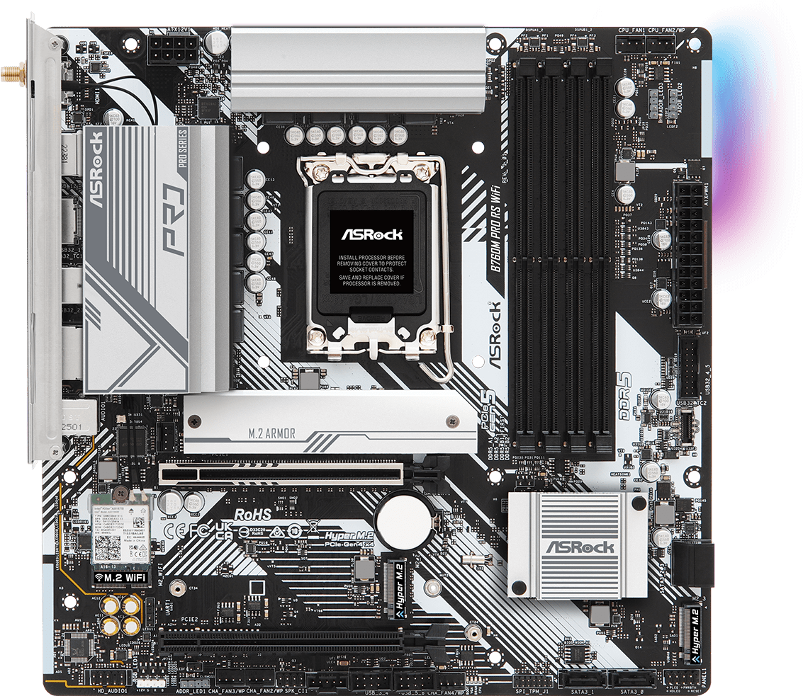 Доставка в 75000 населённых пунктов, ТК СДЭК, Яндекс и Почта РФ Все формы оплаты для физических и юридических лиц! Онлайн конфигураторы ПК и сервера, бесплатная сборка. Гарантия 2 года! Широкий ассортимент комплектующих. Более 30 лет на рынке! 12 990 ₽ ID товара: 782518 Материнская плата ASRock B760M Pro RS WiFi ОсновныеПроизводитель ........................................................................................................................................................................................................ Код производителя ........................................................................................................................................................................................................ B760M Pro RS WiFi Сокет ........................................................................................................................................................................................................ Чипсет ........................................................................................................................................................................................................ ПамятьТип памяти ........................................................................................................................................................................................................ Количество слотов памяти ........................................................................................................................................................................................................ Максимальный объём поддерживаемой памяти ........................................................................................................................................................................................................ 256 ГБ Поддержка ........................................................................................................................................................................................................ Intel XMP Дисковые контроллерыКонтроллер SATA ........................................................................................................................................................................................................ 4 x SATA-III (6 Гб/с) Поддержка RAID ........................................................................................................................................................................................................ 0, 1, 5, 10 Слоты расширенияСлоты расширения ........................................................................................................................................................................................................ PCI-E 5.0 x16, PCI-E 3.0 x16, 3 x PCI-E M.2 Тип слотов M.2 ........................................................................................................................................................................................................ 2 x 2280 (PCI-E 4.0 x4), 2242/2260/2280 (PCI-E 4.0 x4) Поддерживаемые режимы PCI Express ........................................................................................................................................................................................................ x16/x4 Аудио/ВидеоИнтегрированное видео ........................................................................................................................................................................................................ Звук ........................................................................................................................................................................................................ Аудио-контроллер ........................................................................................................................................................................................................ СетьСетевой интерфейс ........................................................................................................................................................................................................ 2.5 Gigabit Ethernet (2.5 Гб/с), Wi-Fi, Bluetooth Сетевой контроллер ........................................................................................................................................................................................................ Dragon RTL8125BG Слот M.2 (E Key) ........................................................................................................................................................................................................ да Версия Wi-Fi ........................................................................................................................................................................................................ 6E Версия Bluetooth ........................................................................................................................................................................................................ 5.3 ИнтерфейсыРазъёмы на задней панели .........................................................................................................................................................................
