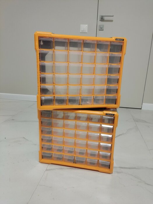 Множество небольших ящиков, использую под радиодетали, очень удобно. Яркая оранжевая обводка придаёт современный вид.