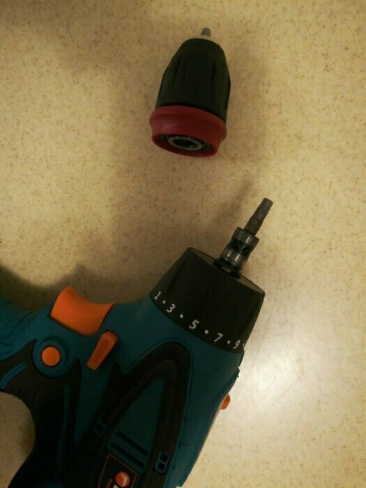 Поначалу переживал за прорезиненную накладку на корпусе. Она резная, есть узкие участки, но держится, как показала практика, как прилипшая, края не задираются. Патрон съемный, на шпильку садится без люфта. Крепление быстрозажимное, бита меняется за секунды, не плавает на инструменте. Пусковая кнопка и реверс рядышком, удобно сделали