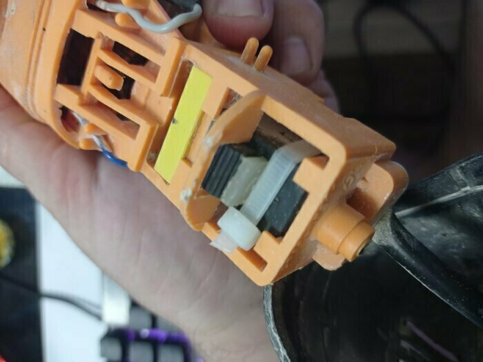 Всё мой мнение основано на том, что поработали ей мало, перед тем, как сдать на металлоприёмку. Об этом говорит цвет смазки, всё ещё полупрозрачный, чистенький, без запаха гари, и износ щёток на треть всего. Так вот, была отломана кнопка включения (типичная поломка), плюс, прикипевший диск на шпинделе, и, как следствие, выломанная, но не до конца, со стороны редуктора, кнопка фиксации вала. Болты, крепящие крышку редуктора, закручены с фанатизмом, и ещё очень мягкие, не видел таких до этого случая, выкручивал крокодилами, закрутил ими же. Никакой защиты статора, только криво намотанная проволока.
