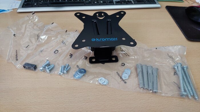 Зачем такой мощный крепёж на 8 мм для телевизора 32 дюйма? На этом кронштейне 2 человека смогут висеть спокойно. В монолит очень сложно таким сверлом точно отверстия просверлить и не сместиться. А свободного хода на отверстиях планки совсем нет. Удалось вкрутить только 3 самореза и то не до конца. Хорошо, что за телеком не видно. Комплектные болты для телека на 5! Пришлось идти докупать на стандарт. Короче, та ещё заморочка. Уровень на магните отлетает постоянно.