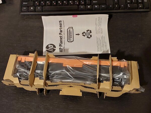 Очень просто заменить и установить, картридж в антиударной упаковке и с заглушками, предотвращающими от случайного просыпания тонера во время транспортировки.
