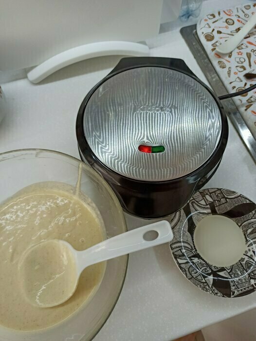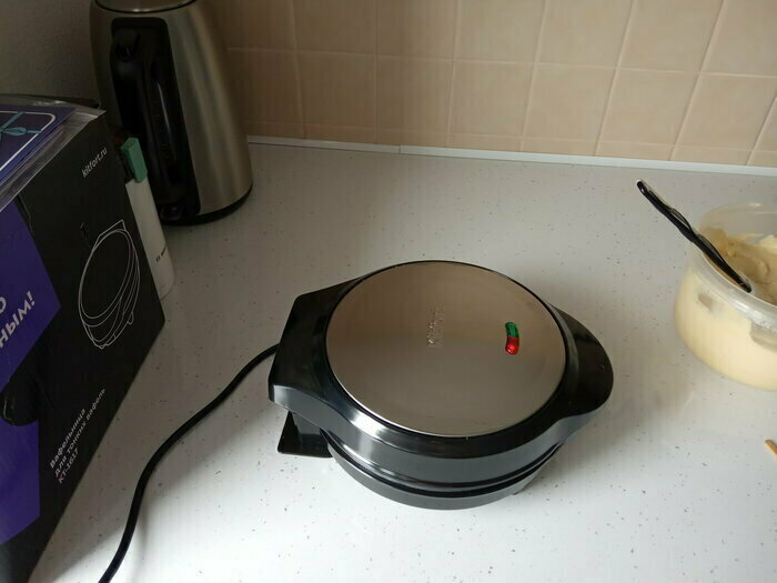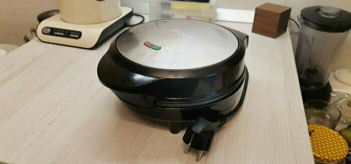 у этой модели нет таймера отключения, приходится засекать время отдельно. Но как бы я ни старалась с одного края вафли всегда прожарены сильнее, чем с другого. Ни варианты сделать тесто пожиже-погуще, ни налив с одного края, ничего, увы, не помогло. Так что лежит помощница и только дети ею балуются иногда