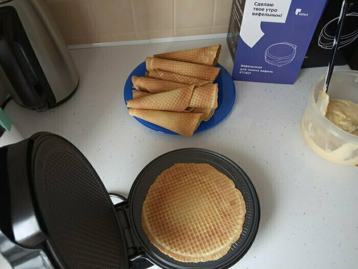 Быстро нагревается, равномерно пропекает, удобно чистить, не занимает много места. Очень нравится продукция Kitfort. Очень долго мечтал о вафельнице. Купил Kitfort и очень довольна. Вафельки получаются как в детстве, на старой советской вафельнице. Тонкие, хрустящие, ровненькие. Вафельница очень удобная, компактная и аккуратная по размеру, что хорошо при готовке и результате. Вафельки получаются как надо, небольшие, удобно сворачивать в трубочку. Нагревается довольна быстро, чиститься после готовки тоже. Очень удобно пользоваться и хранить. Не занимает много места.