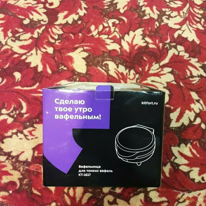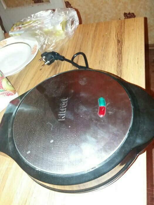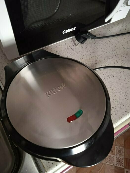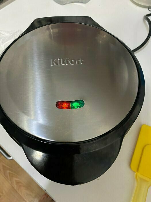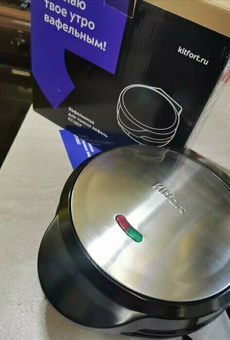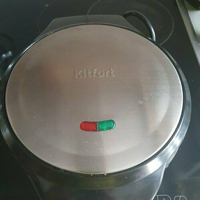 Приобрели данную вафельницу Kitfort KT-1617 на смену старой советской. Новая вафельница легка в использовании, нужно включить её в розетку и дождаться нагрева. На верхней крышке имеются два индикатора, один о подключении к сети, второй индикатор нагрева, т. е. когда он погаснет можно приступать к выпеканию. Вафельки получаются тонкие хрустящие, но пропекается не равномерно. По краям зажаривается, а в центре нет. Но со временем можно будет приловчиться. Панели антипригарные, легко моются. Шнур коротковат, но нам хватает. В целом покупкой довольны, тем более за такую стоимость!